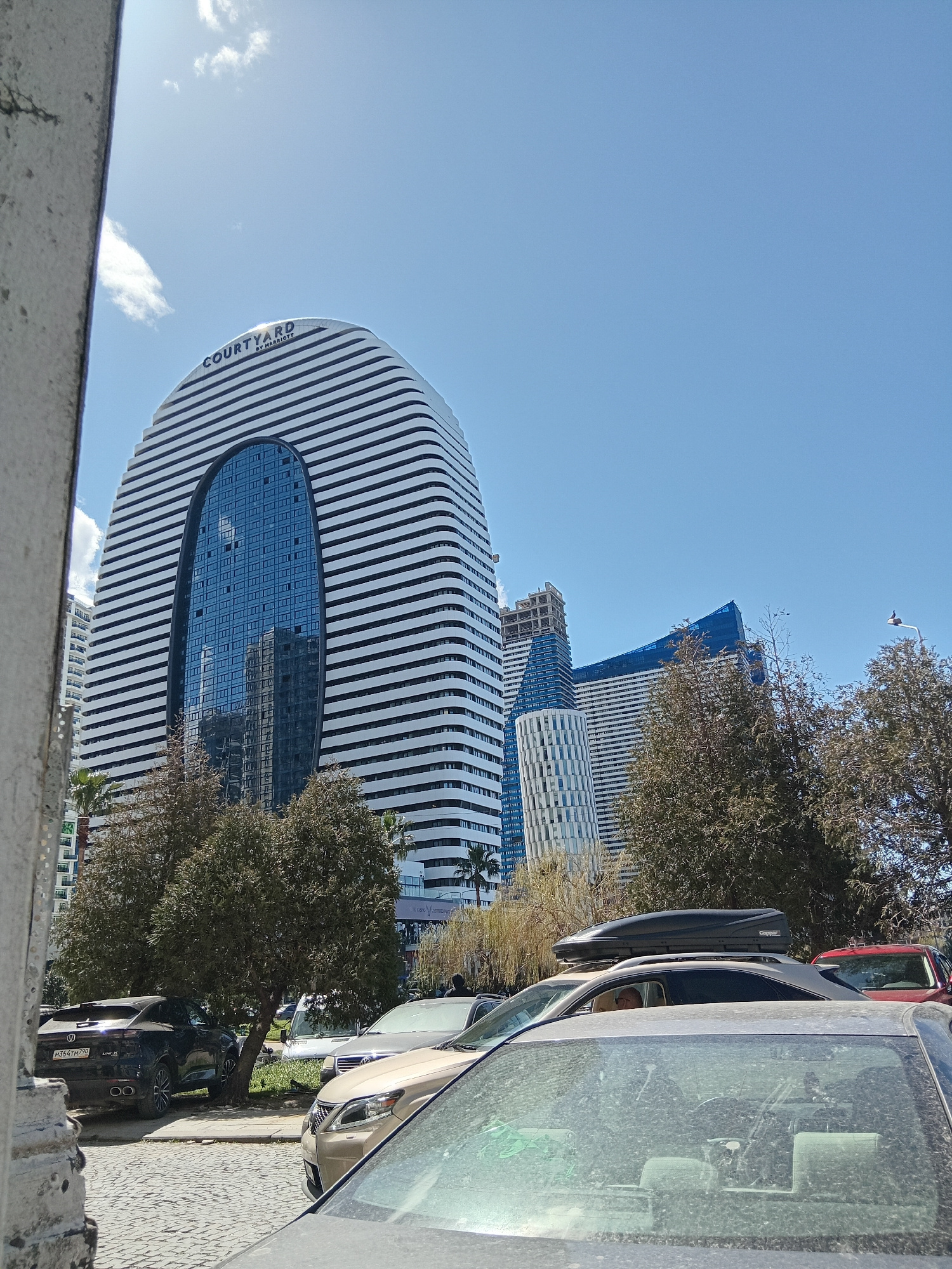 The image shows a view of the Courtyard by Marriott hotel in Batumi, Georgia, from a street-level perspective. The hotel has a distinctive oval shape with horizontal white stripes and a large elliptic…read more