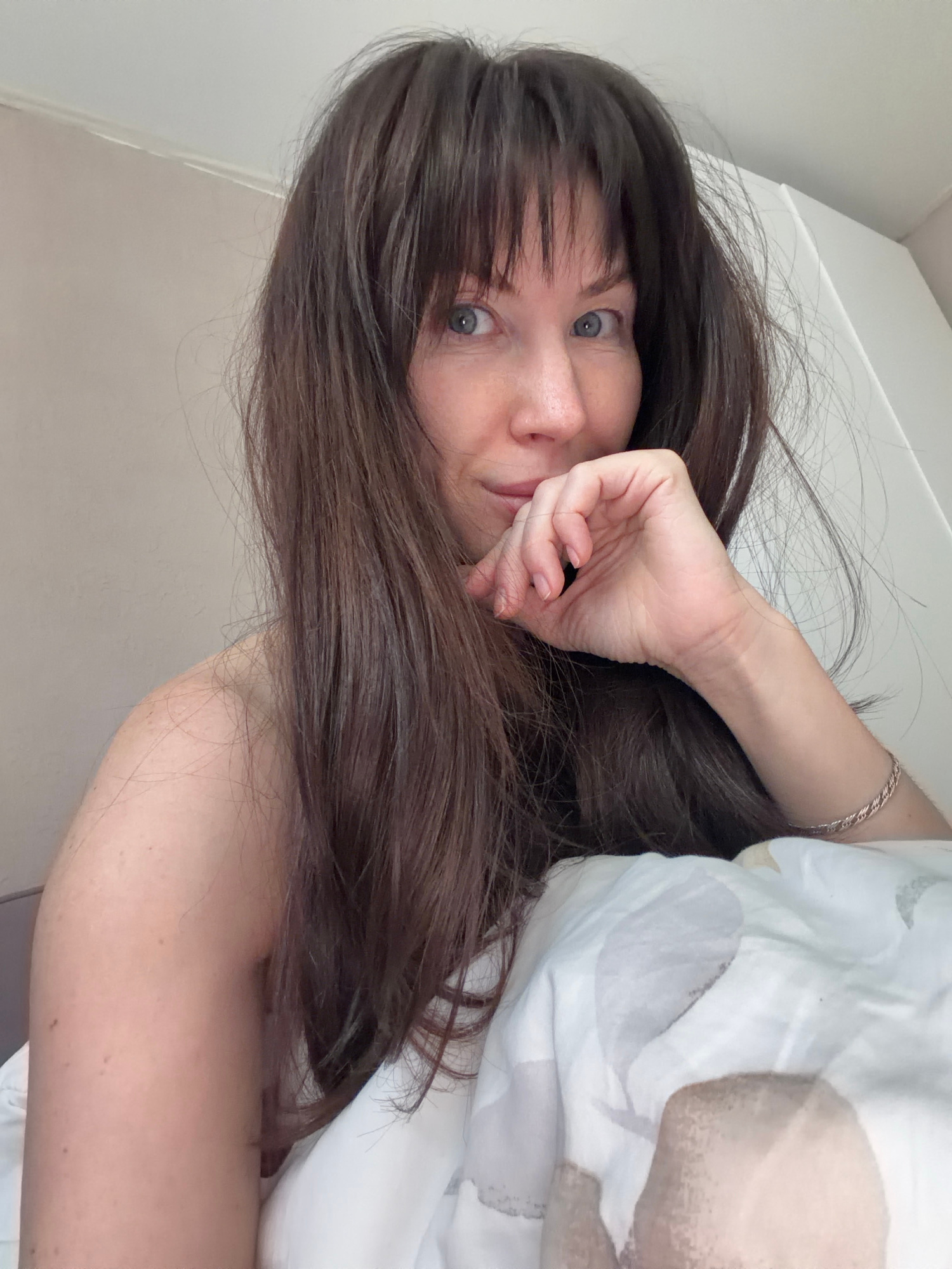 A woman with dark brown hair and bangs, fair skin, and blue eyes is lying in bed. Her head is tilted to the right, and her left hand is raised to her face, with her fingers curled slightly. She appear…read more