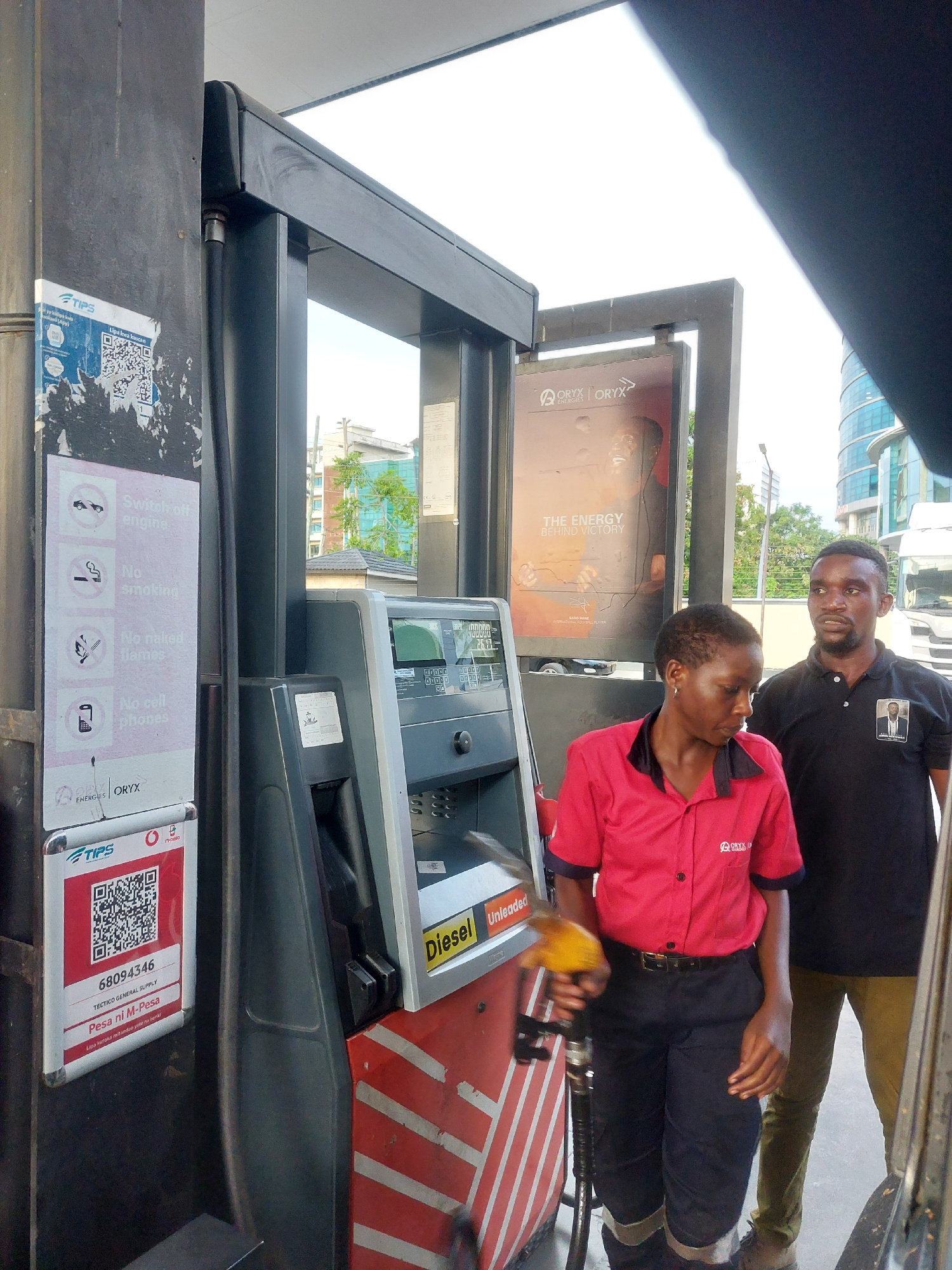 Here is a forensic description of the image: **Scene:** A daytime scene at an Oryx Energies gas station in Dar es-Salaam, Tanzania. **People:** Two African men. One man, is wearing a black polo shir…read more