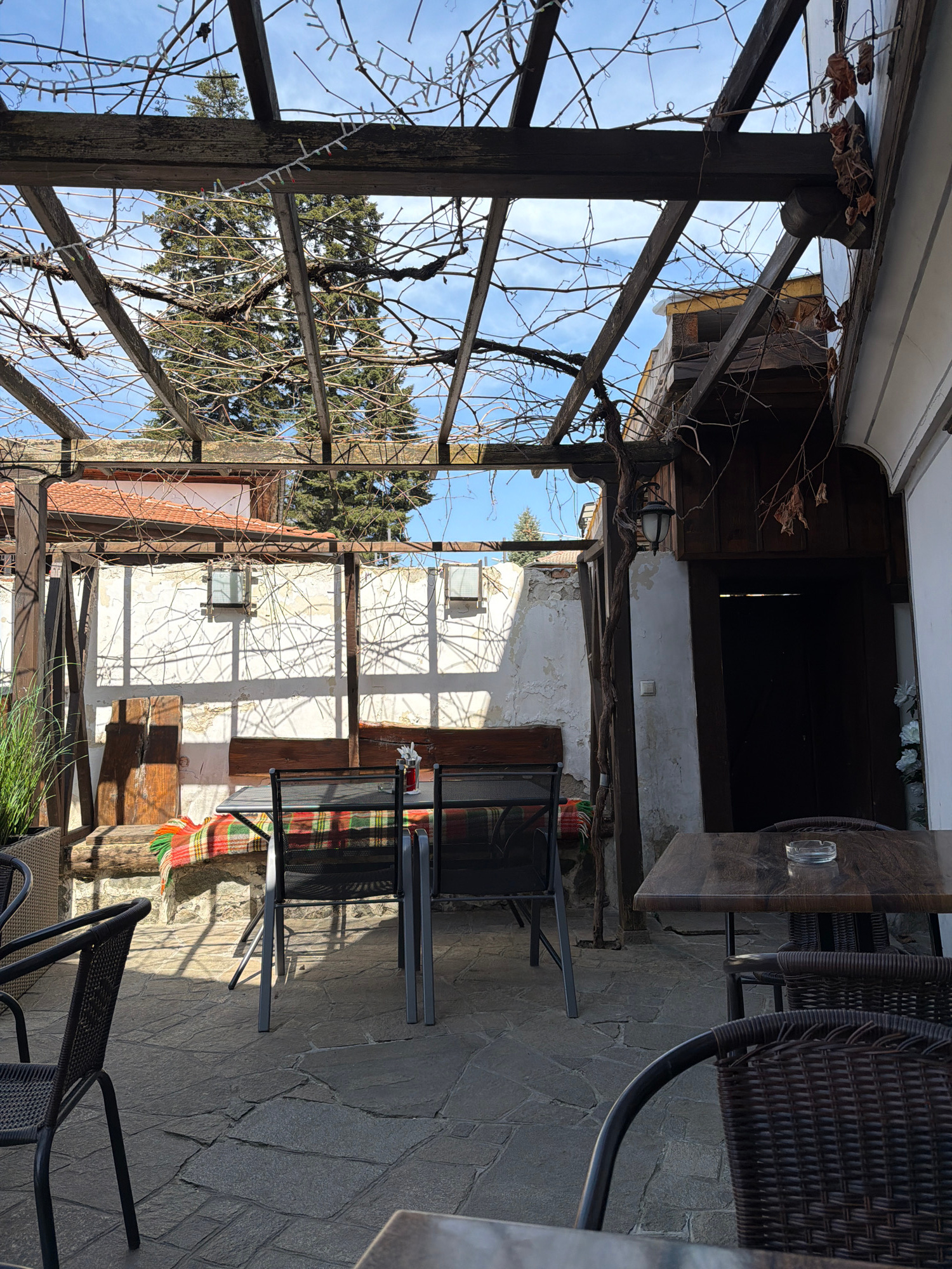 An outdoor patio or courtyard in Kalofer, Bulgaria, is captured on a bright, sunny day, likely in late autumn, winter, or early spring. The scene features a rustic setting with a stone-paved ground an…read more