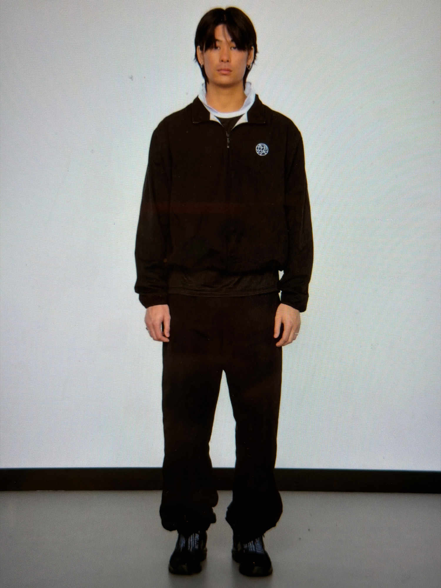 A person wearing a dark-colored tracksuit stands against a white wall. The person has dark hair and is wearing black shoes. A dark, vertical line appears on the right side of the image. The location i…read more