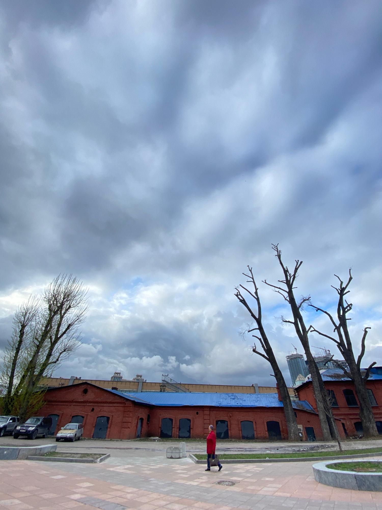 The image shows a cloudy sky over a red brick building in Moscow, Russia. The building has a blue roof and dark windows. Bare trees line the edge of the building. A person in a red coat stands on a br…read more