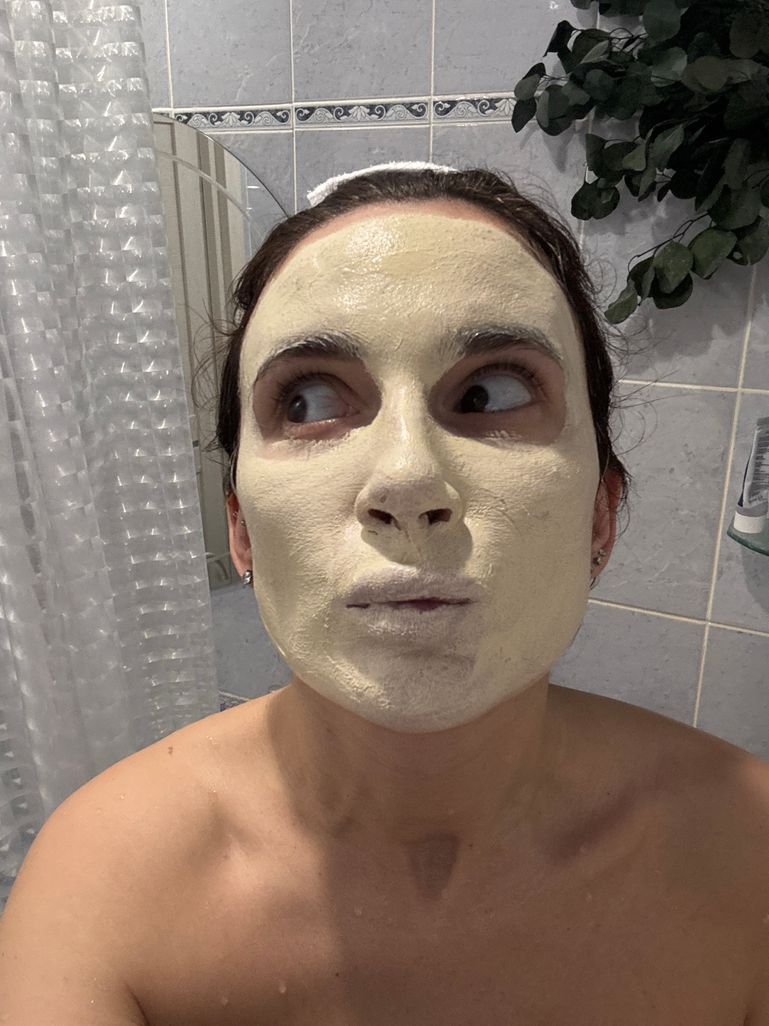 A woman with a light-yellow facial mask is in a bathroom with light-blue and white tiles. She has dark hair and a white towel headband. A plant is in the upper left corner of the frame. A shower curta…read more