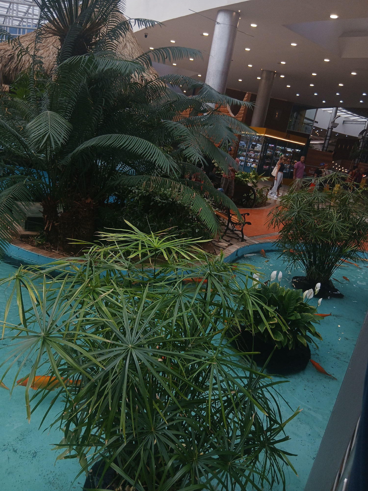 The image depicts an indoor garden or water feature within a shopping mall or commercial space. The location is inferred to be within the city of Pampatar, Venezuela. The foreground is dominated by lu…read more