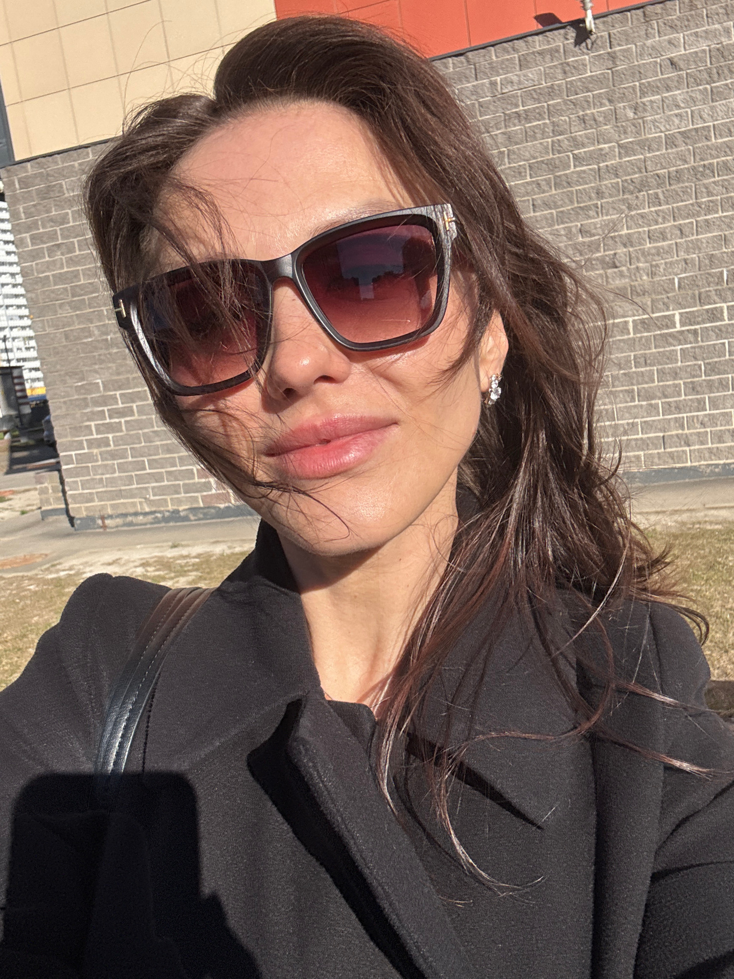 The image captures a close-up, rotated portrait of a woman taking a selfie outdoors in Murino, Russia, under bright daylight. She is seen from the chest up, with her head tilted significantly to the l…read more