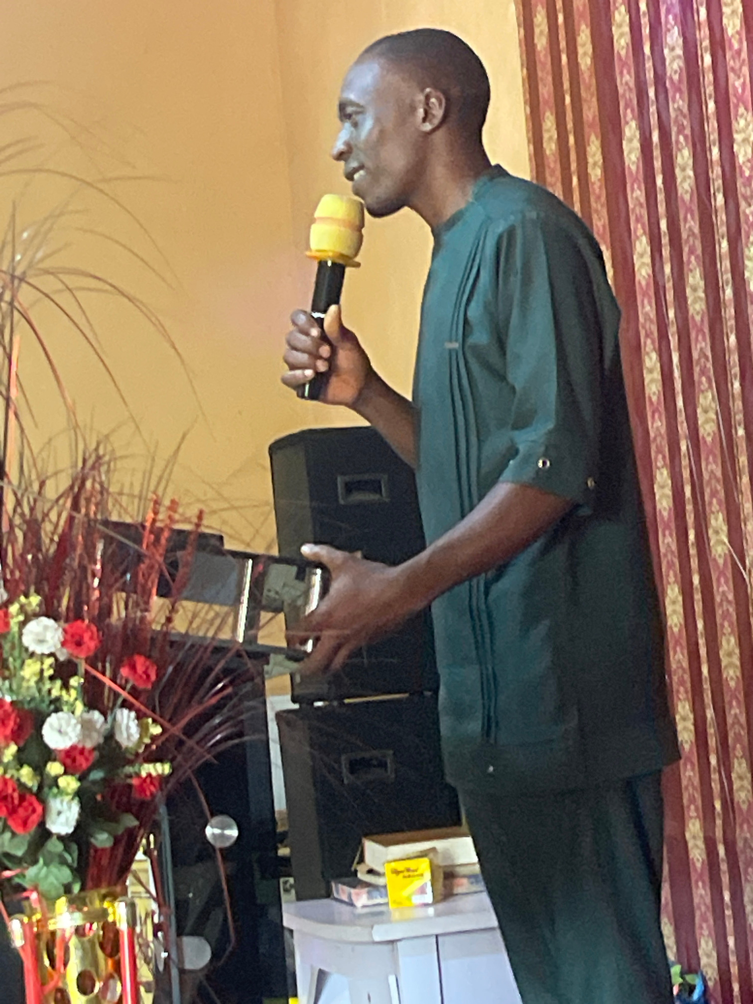 A man is speaking into a microphone with a yellow-colored windscreen. He is wearing a dark green long-sleeved shirt. Behind him are speakers, and in front of him, there is a flower arrangement with red and white flowers. The background has a red and gold pattern. The location is Unknown, Unknown. | Open Wire