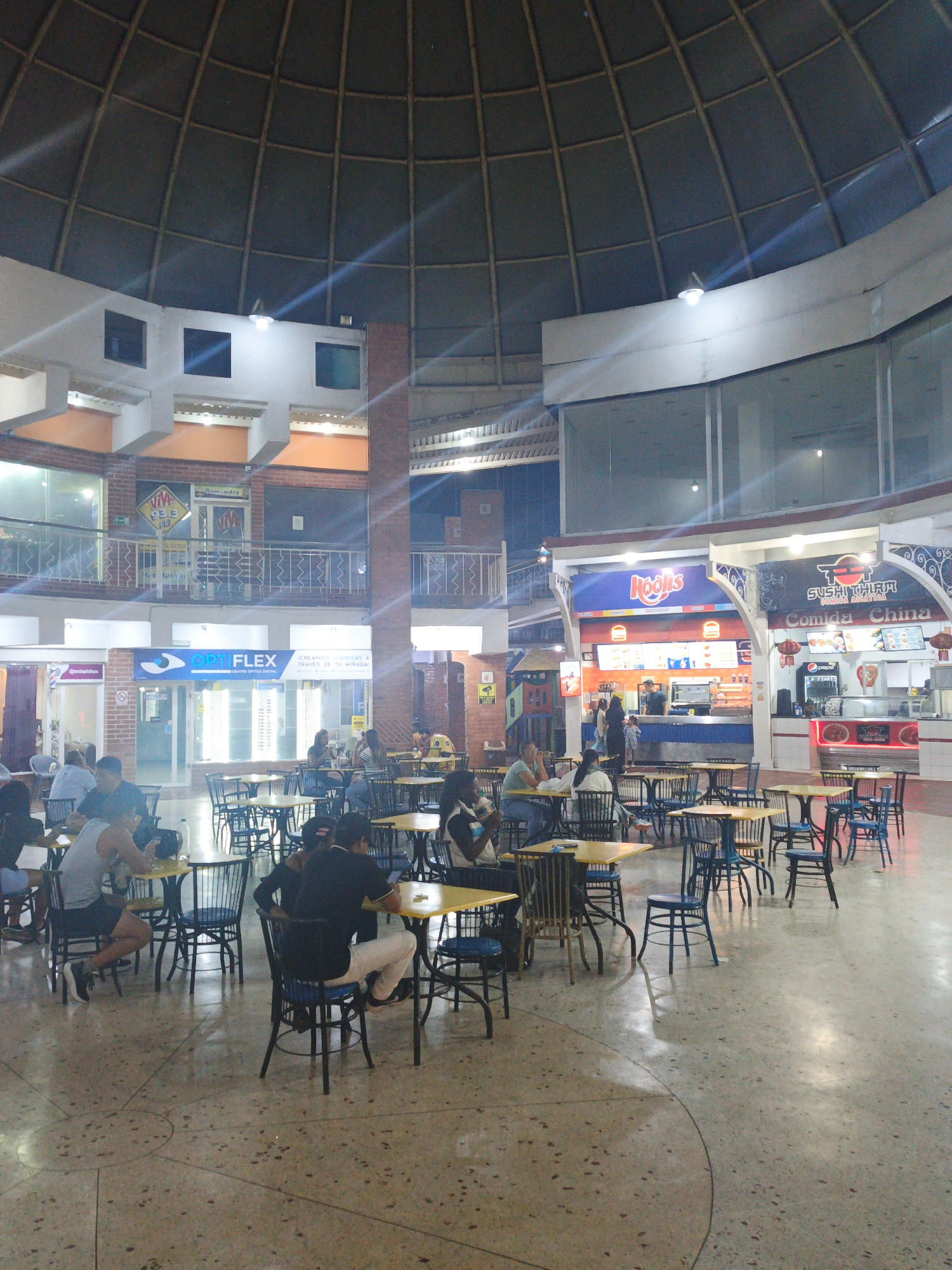 This image captures a bustling indoor food court or commercial area, likely within a shopping center, in Tinaquillo, Venezuela. The expansive space is characterized by a prominent domed ceiling with a…read more