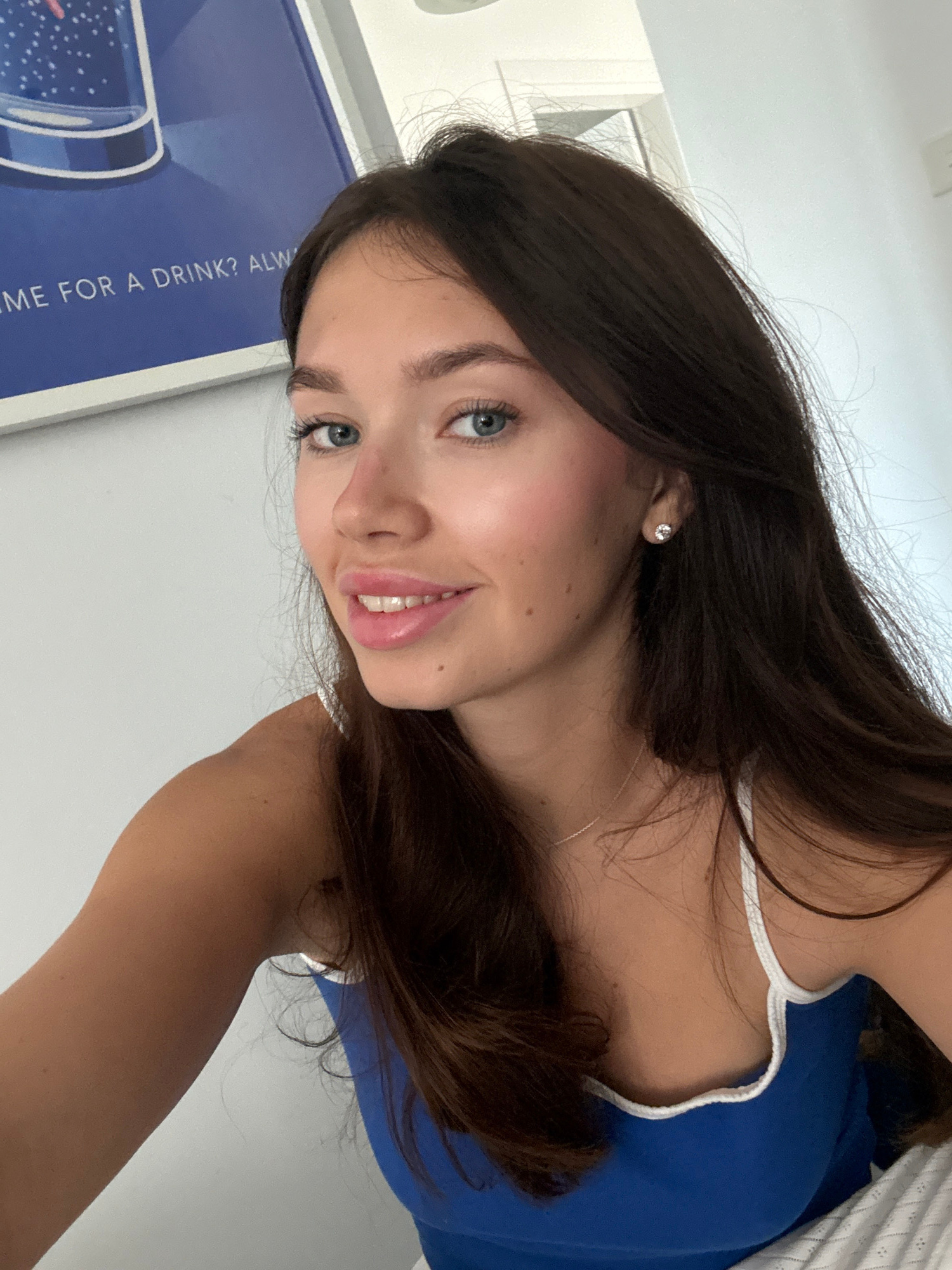 A young woman is depicted in a selfie taken indoors. She has long, dark brown hair, blue eyes, and fair skin. She is wearing a blue top with white trim. The background includes a white wall and a fram…read more