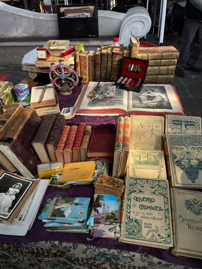 The image displays a detailed view of an antique and vintage goods vendor stall, likely located outdoors in a public space within Puebla, Mexico. The foreground features a table draped with a dark pur…read more