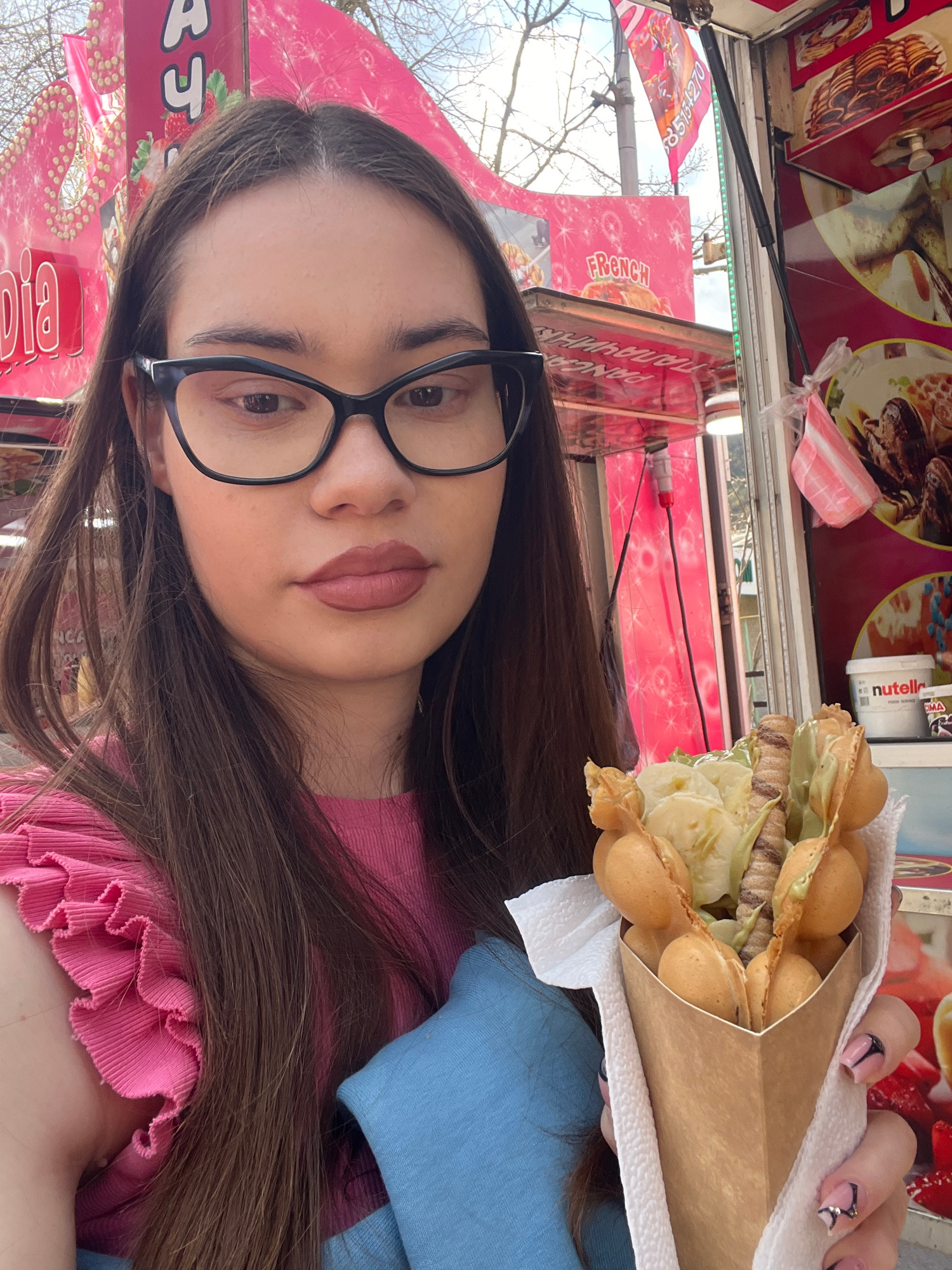 A young woman wearing glasses is holding a dessert similar to an egg waffle cone. The filling appears to be a combination of white lettuce and other fillings. The woman is wearing a pink ruffled shirt…read more