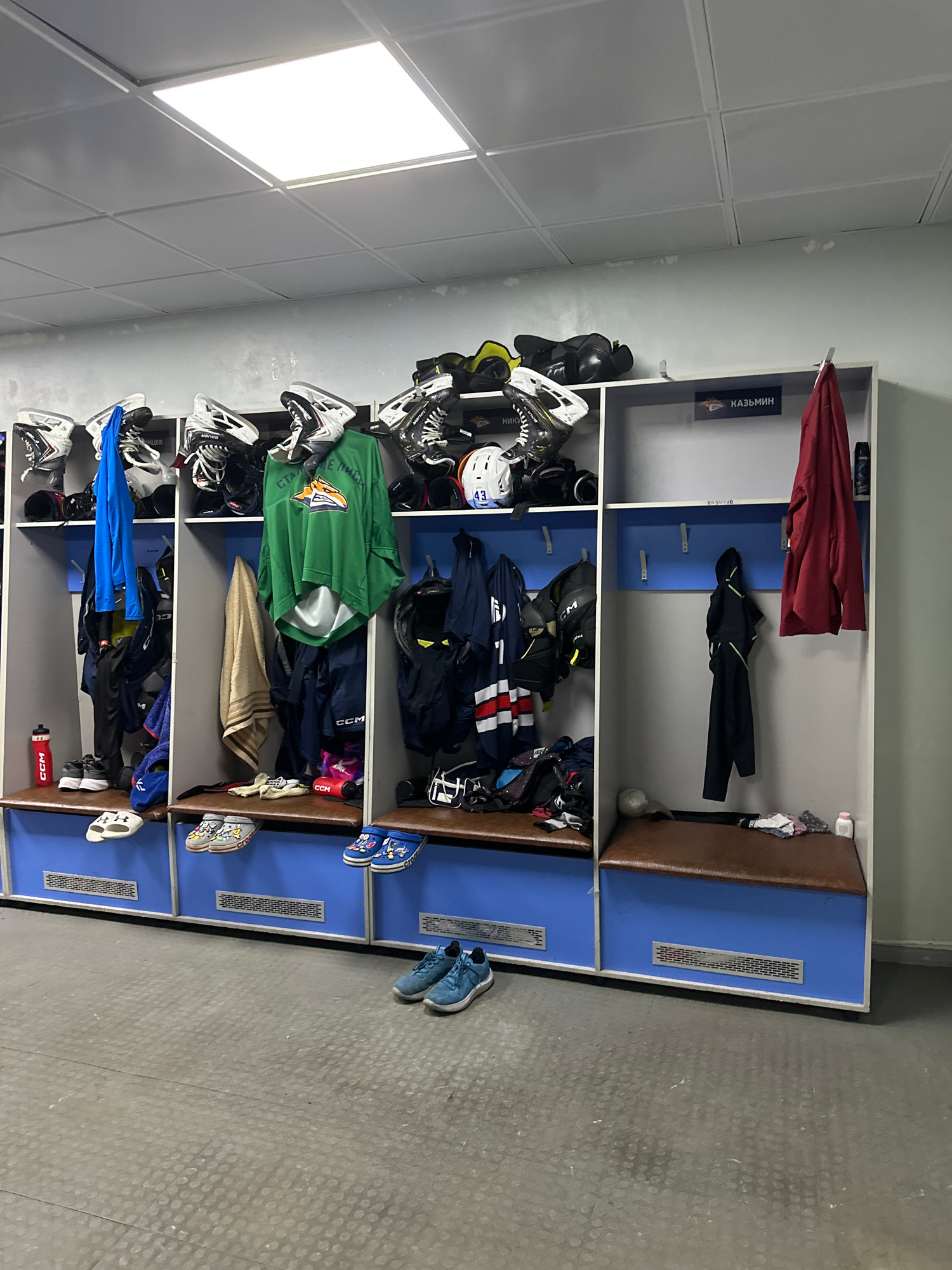 This image depicts an empty ice hockey locker room, viewed from a slightly elevated perspective. The central focus is a long row of blue and grey cubbies or stalls, each equipped with hooks for hangin…read more
