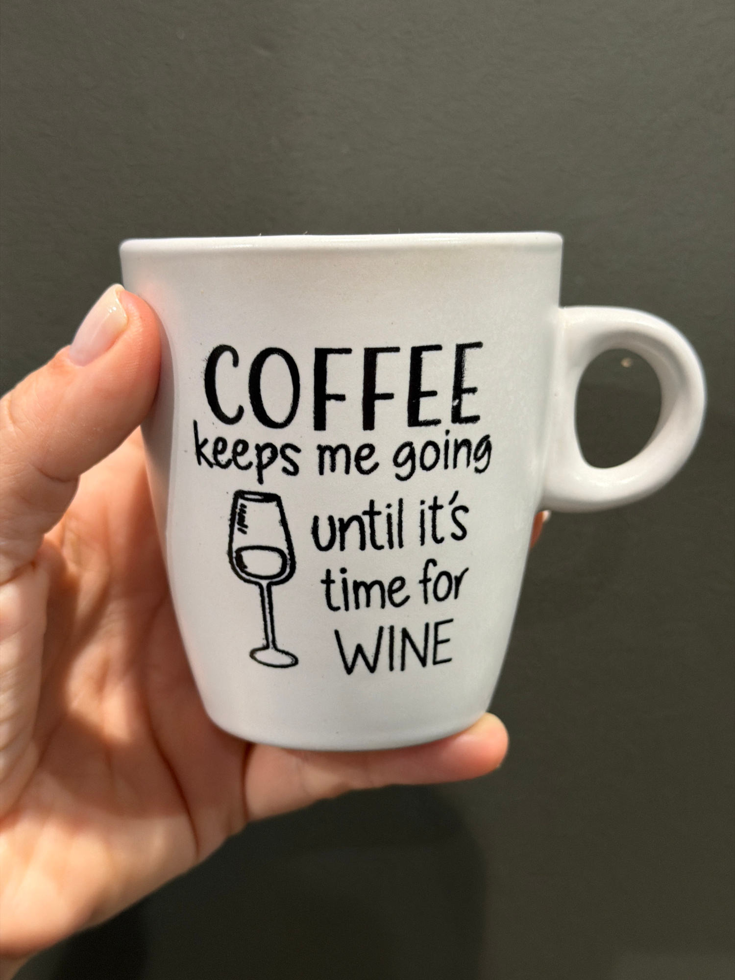 A hand holds a white mug with a black inscription "COFFEE keeps me going until it's time for WINE" with a wine glass graphic. The background is a dark, solid color. The location is not discernible fro…read more