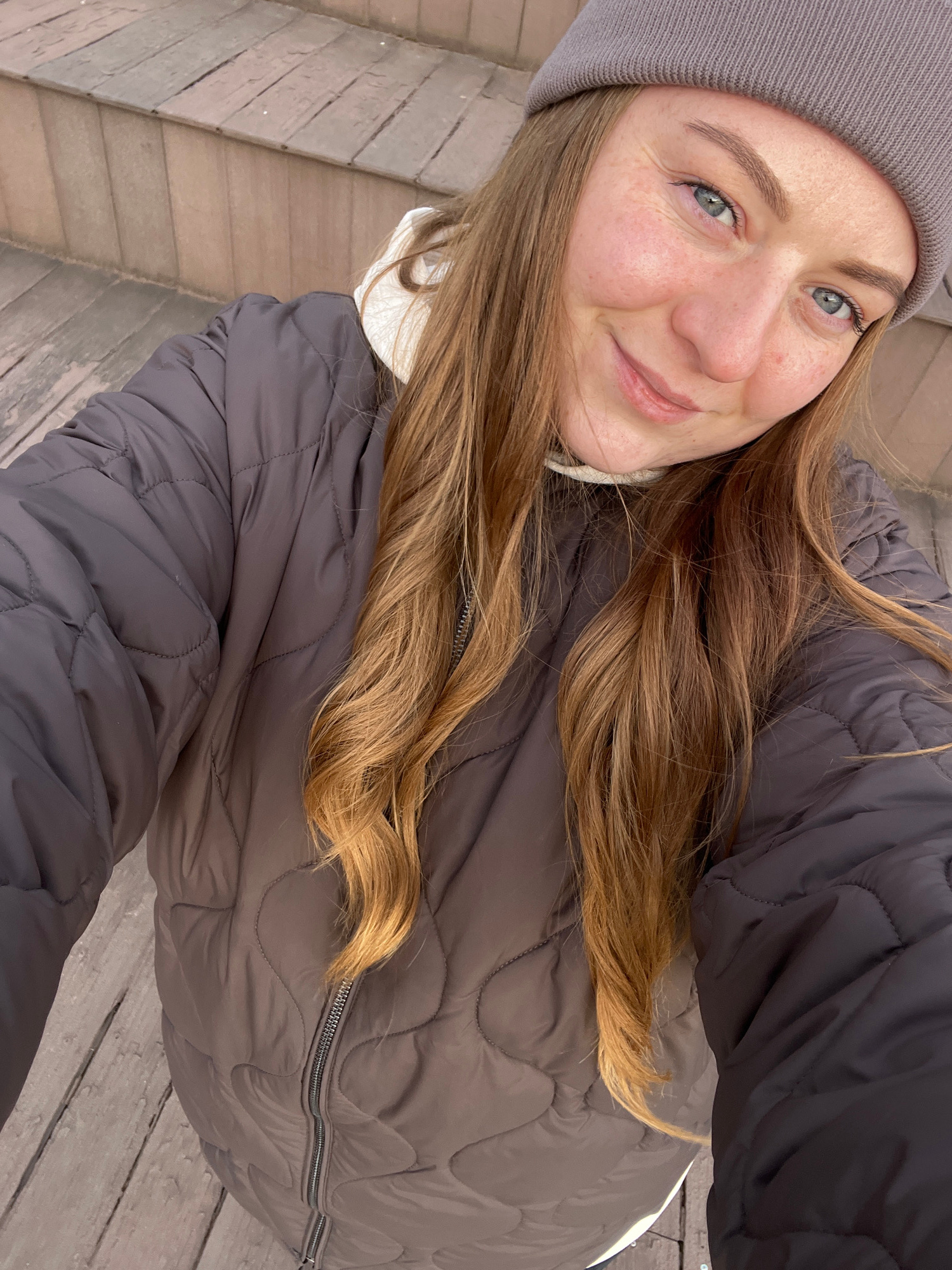 A woman with fair skin, blue eyes, and freckles is wearing a gray beanie and a quilted gray jacket. She is standing on a wooden deck, possibly in a city. The location is Klin, Russia.