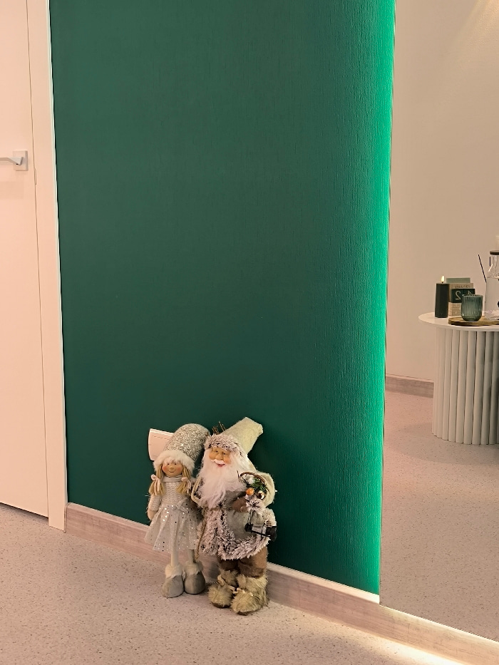 The image displays an interior space located in Vinnytsia, Ukraine. In the foreground, two decorative figures are positioned against a deep emerald green wall with a subtle vertical texture, situated…read more