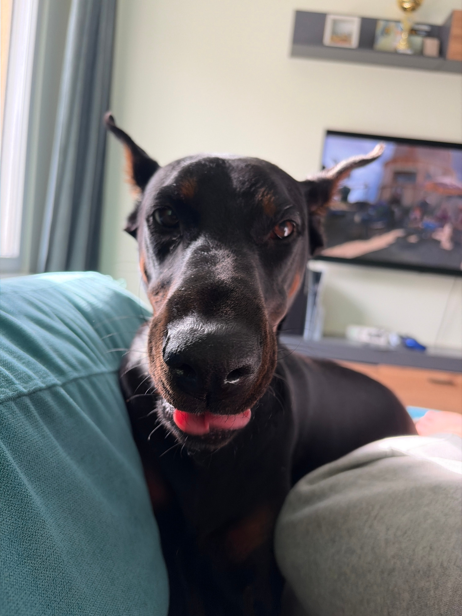 A black and tan Doberman Pinscher dog is lying on a light blue cushion or piece of furniture. The dog is positioned close to the camera, its head tilted towards the viewer. Part of a person wearing a…read more