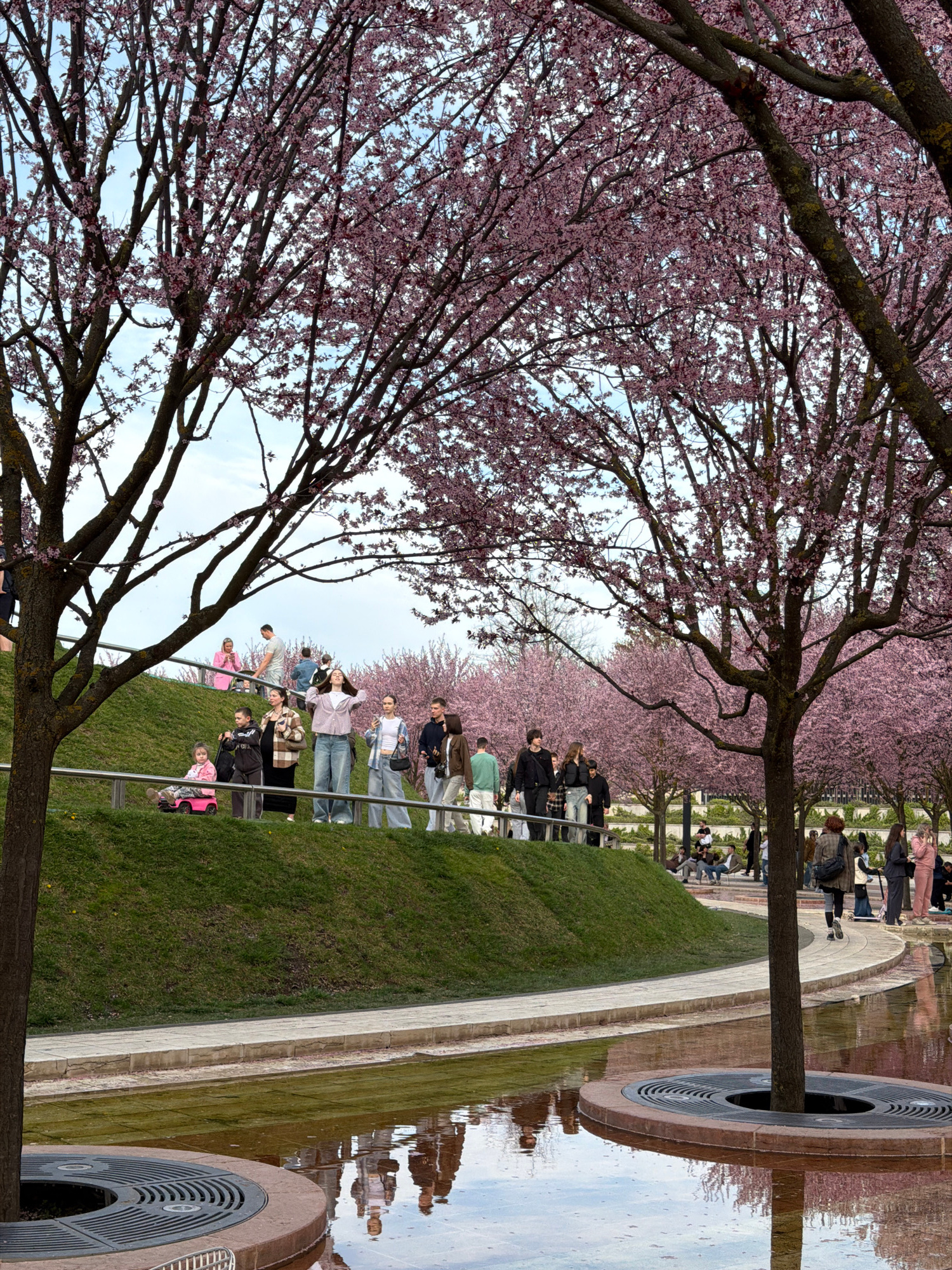 The image shows a scene in Krasnodar, Russia. People are enjoying a row of blossoming trees with pink flowers, situated on a grassy slope. A walkway runs parallel to the row of trees. A body of water…read more