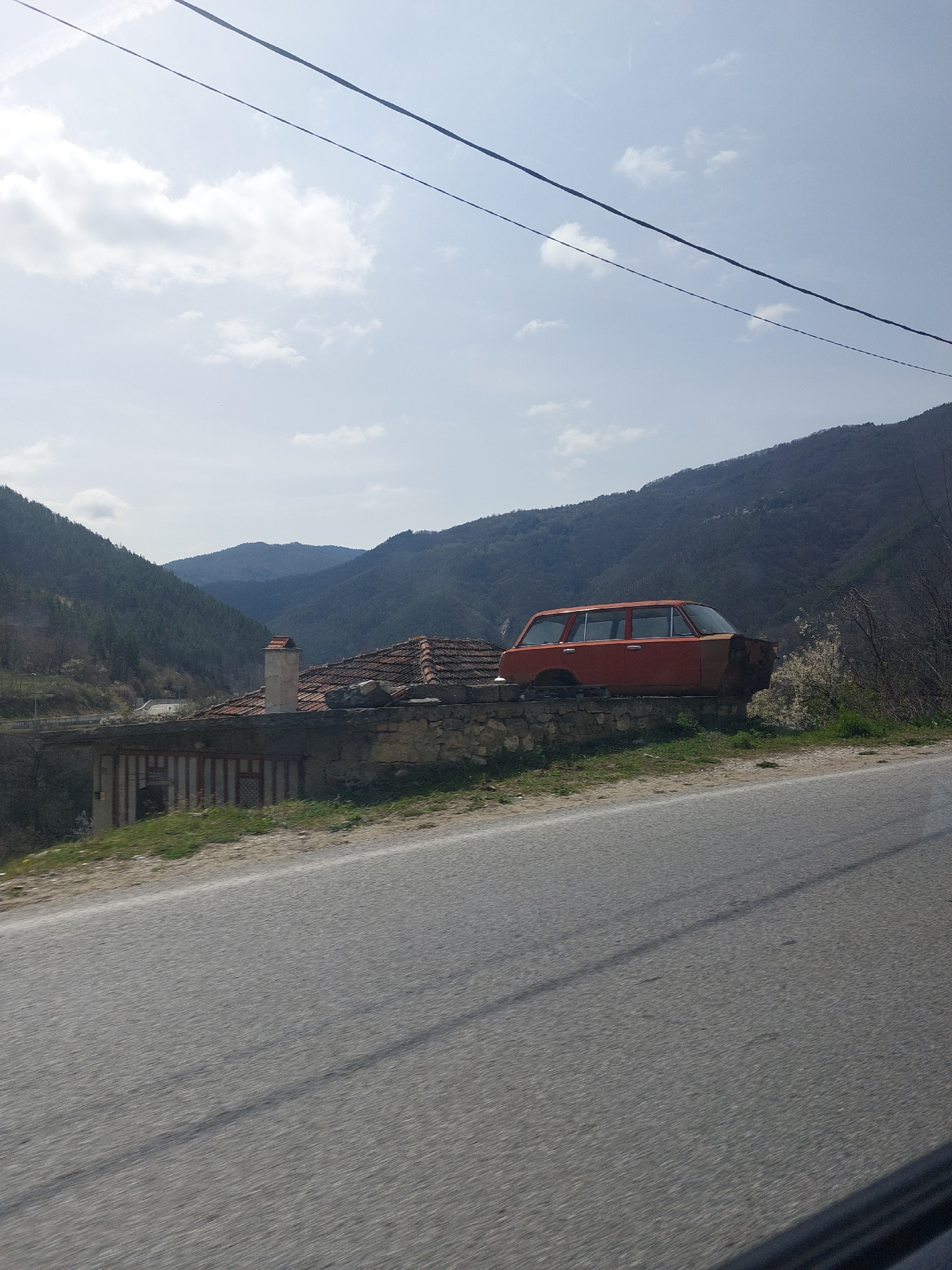 The scene appears to be a roadside view in Mihalkovo, Bulgaria. A vintage, orange car is parked (or possibly abandoned) next to a building, which seems to be a residential structure with a tiled roofβ¦read more