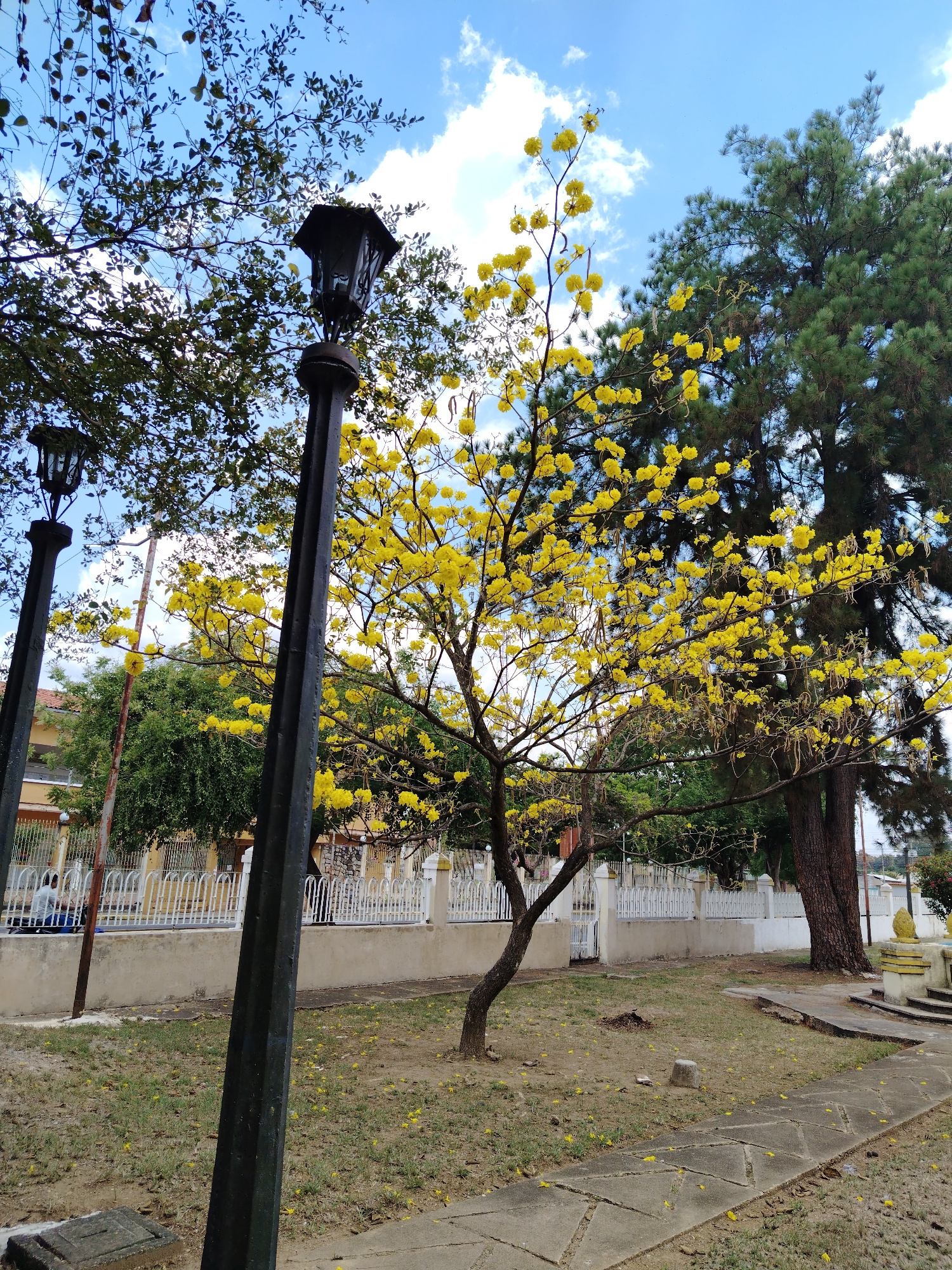 The image depicts a public park in Tinaquillo, Venezuela. A mature Handroanthus chrysanthus tree, laden with yellow blossoms, is the focal point. To the left, a cast-iron lamppost stands tall. The par…read more