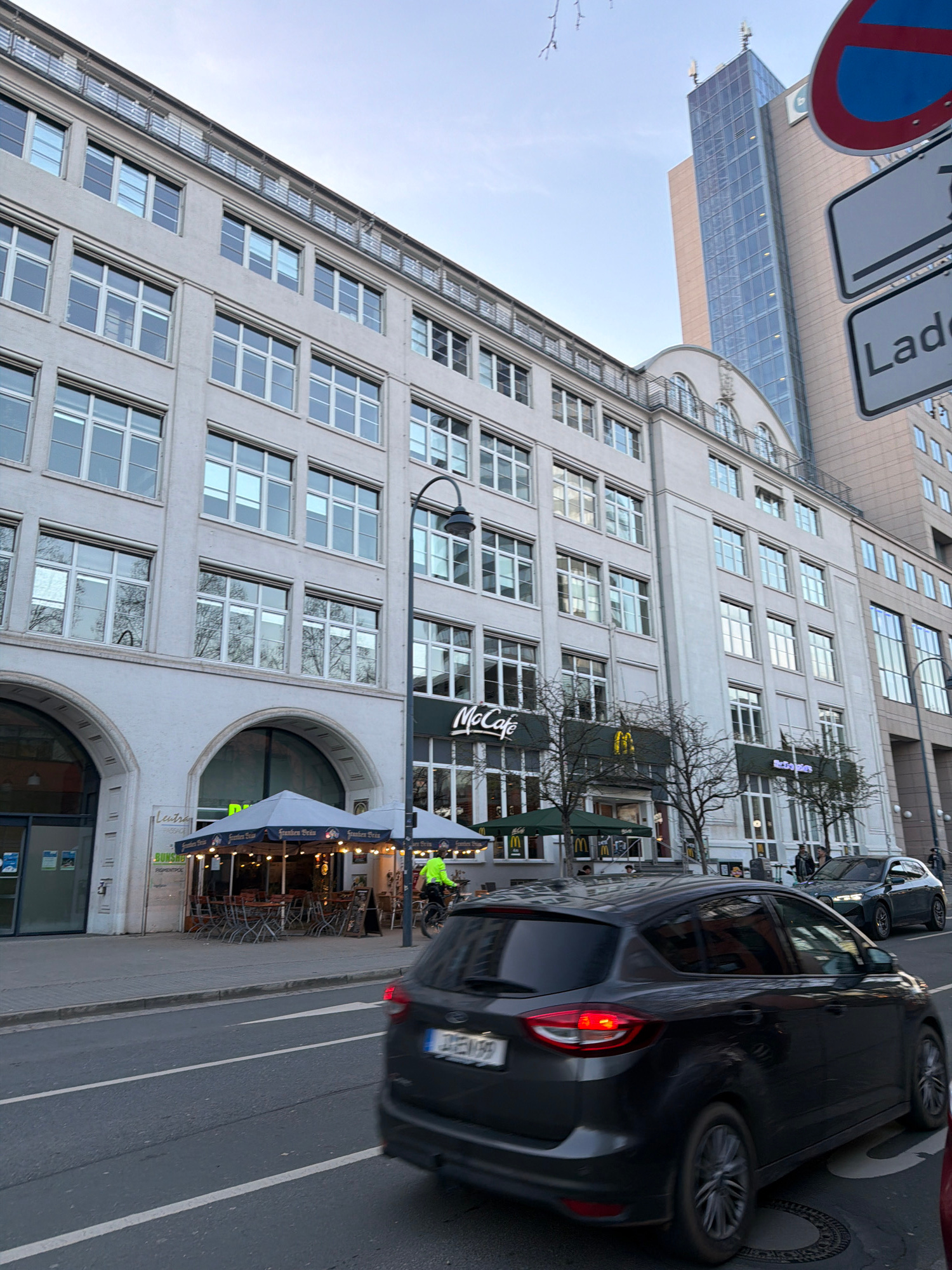 The image shows a street scene in Jena, Germany. A multi-story building with rows of windows dominates the left side of the frame. A McDonald's and McCafe are visible on the lower floors. A street lam…read more