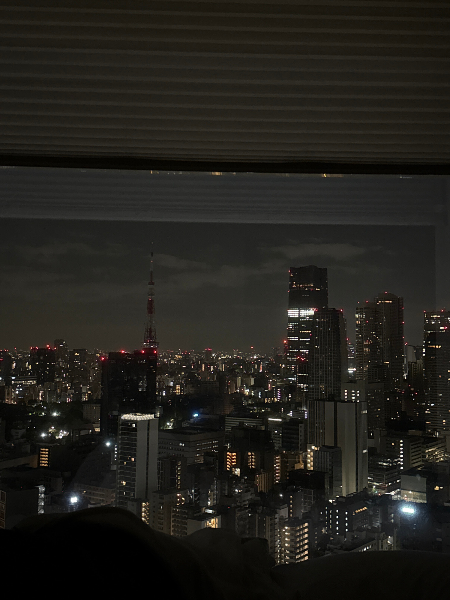 An image of a nighttime view of the city of Minato, Japan, as seen from a high vantage point, likely a skyscraper. Through the window, a cityscape is visible, defined by numerous illuminated buildings…read more