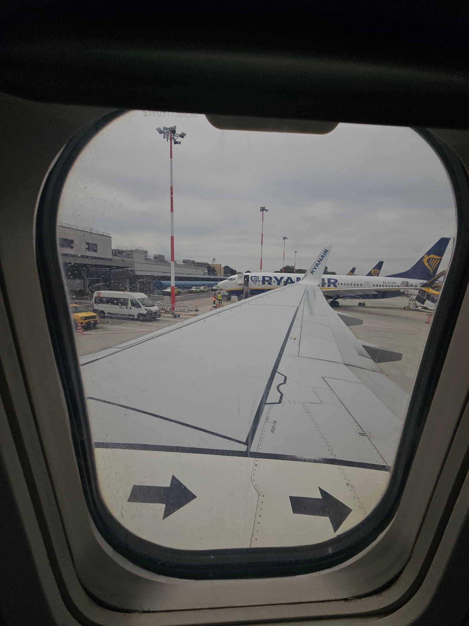 The image shows an airplane wing as seen through an airplane window. The plane is a Ryanair plane. Another Ryanair plane is visible in the background. The plane is on the ground near an airport buildi…read more