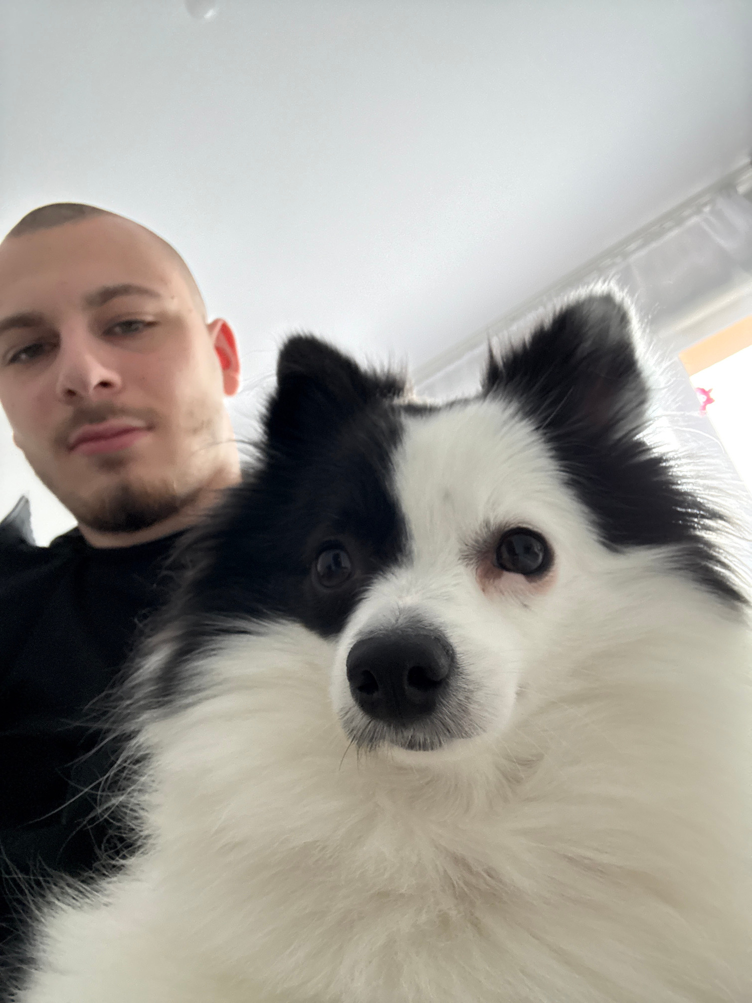 The image is a close-up selfie looking upwards, featuring a man and a black and white dog. The man has a shaved head and stubble, and he's wearing a dark shirt. The dog is positioned above the man, itβ¦read more