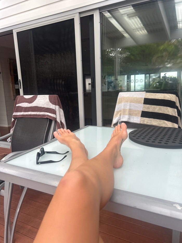 A person's legs rest on a white table next to sunglasses. Behind them, two chairs are draped with patterned towels. A striped towel covers another object on the table. Sliding glass doors reveal a vie…read more