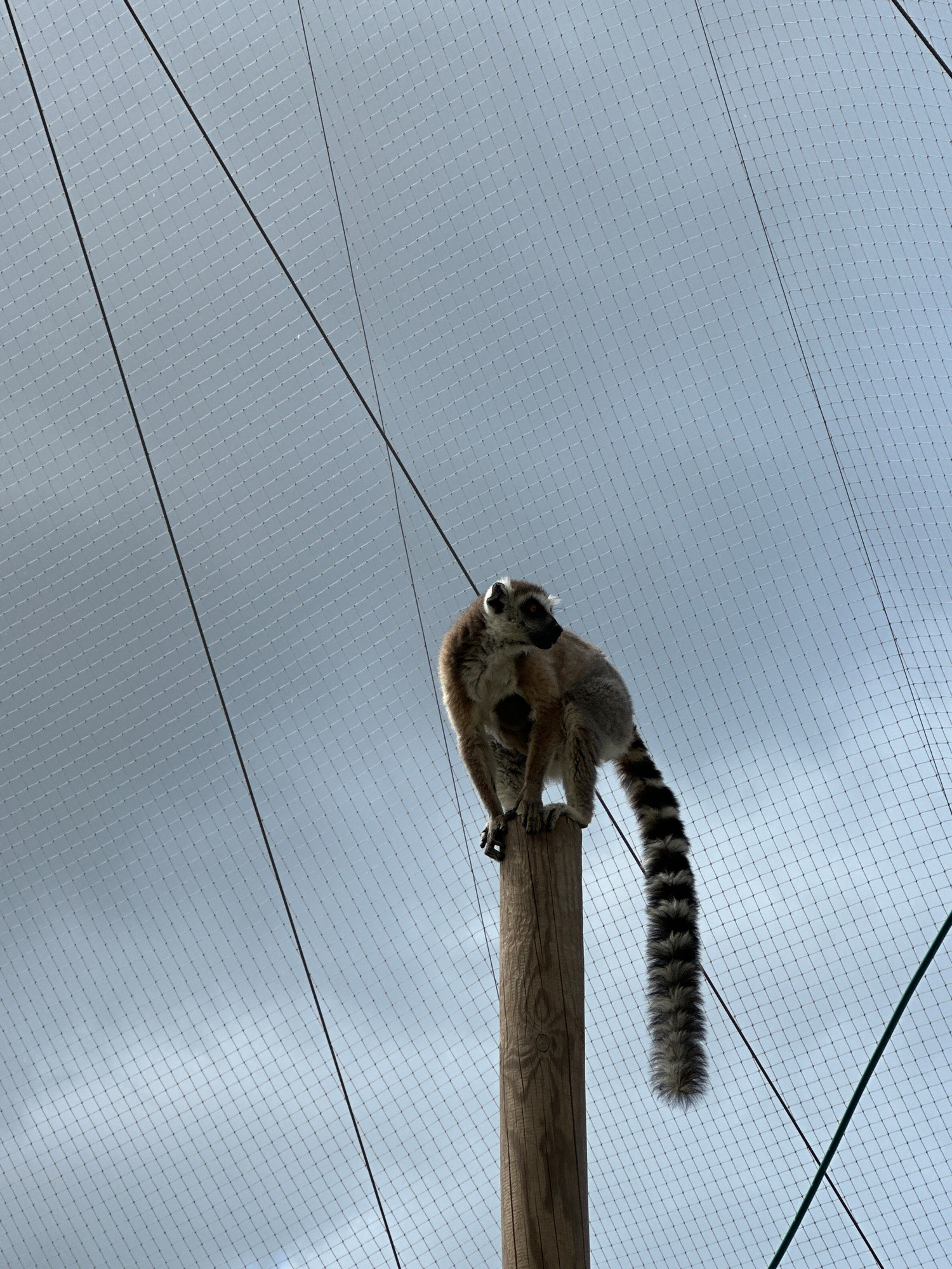 The image shows a ring-tailed lemur perched on a wooden beam, viewed from below against a backdrop of a grey sky obscured by a mesh netting. The lemur's distinctive striped tail is prominently visible…read more
