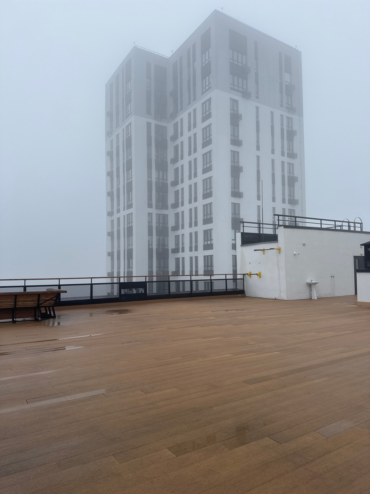 A partially fog-obscured view of a modern, high-rise apartment building and a wooden building in Ulyanovsk, Russia. The apartment building is white with many windows. The wooden structure is low and a…read more