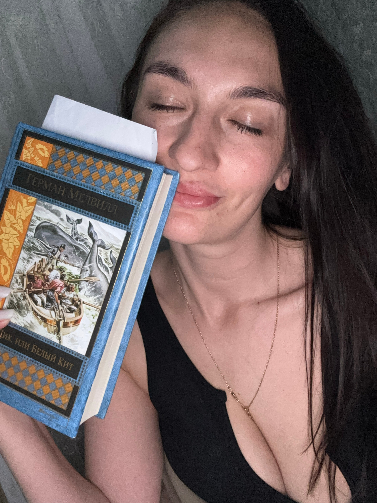 A woman is lying down indoors. Her eyes are closed and she is smiling softly. She has long dark hair and is wearing a black top and a gold necklace. She is resting her head on a book written in Russia…read more