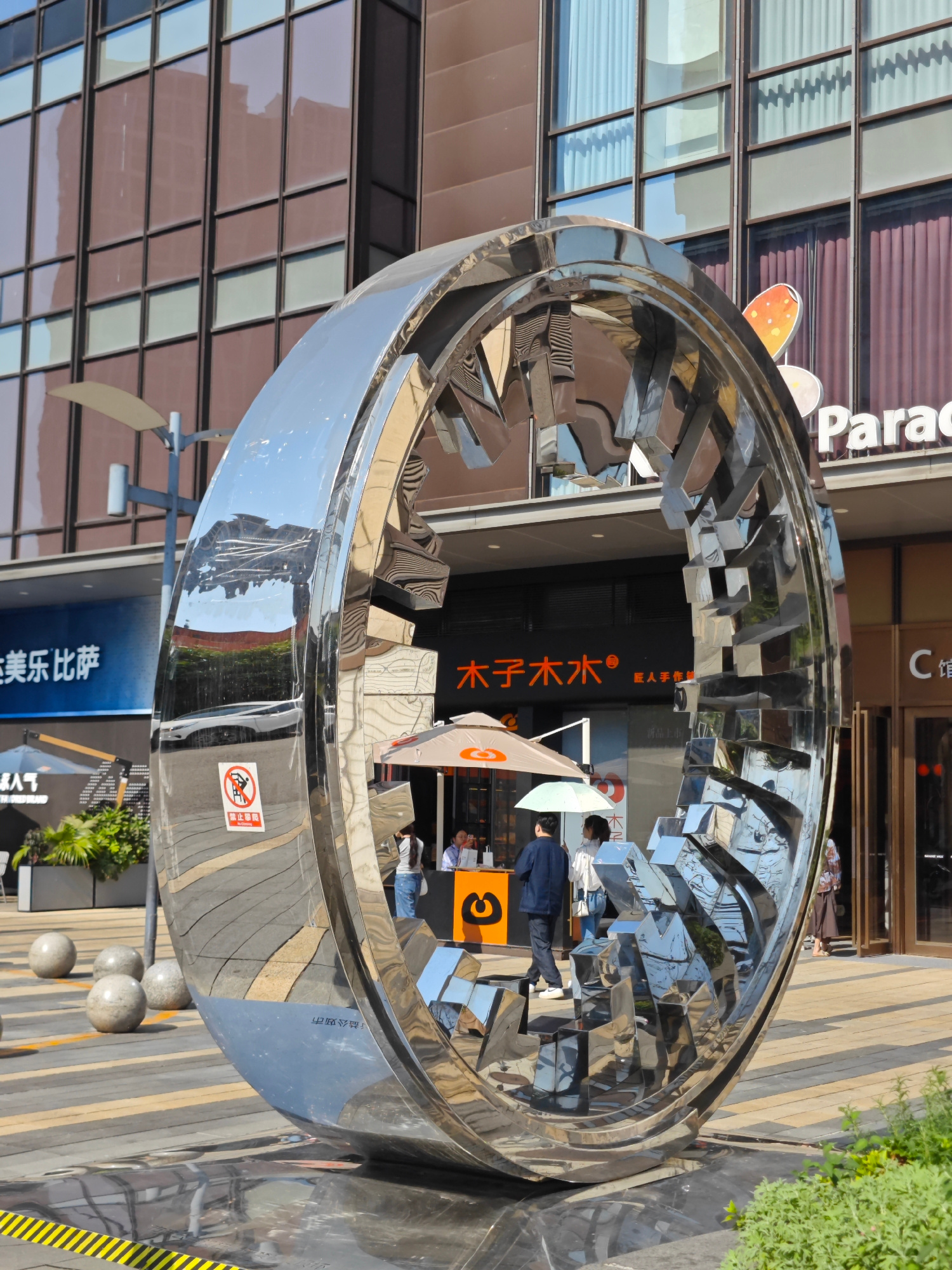 Here is a description of the image: The image shows a large, shiny, circular sculpture in a public space. The sculpture appears to be made of chrome or stainless steel, and its surface reflects the s…read more