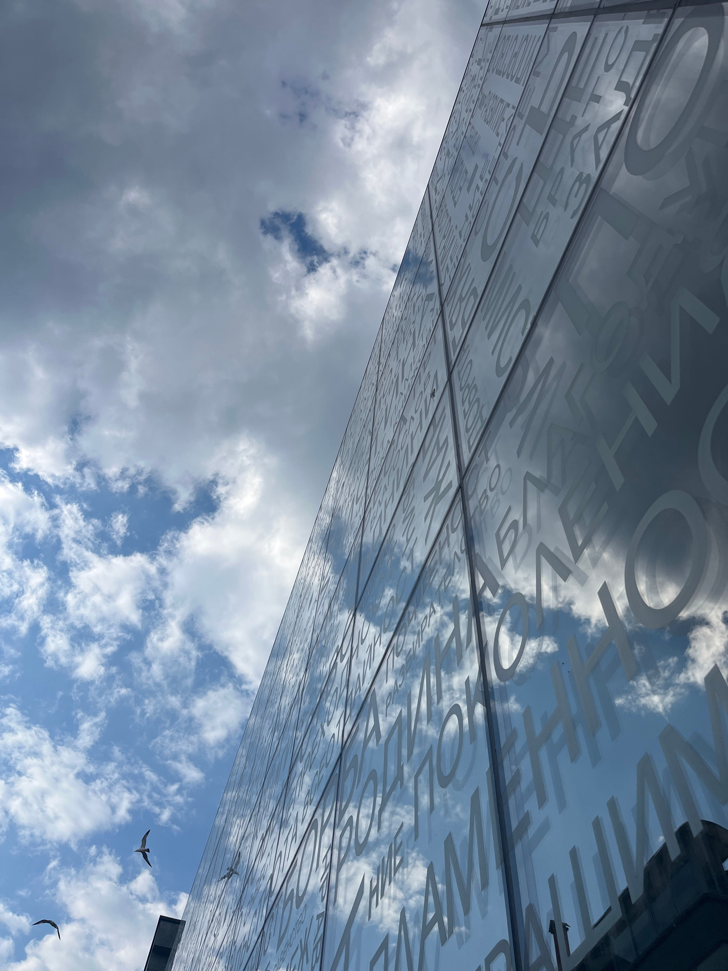 A low-angle shot shows a building facade with white lettering on a glass surface reflecting the sky. The sky is mostly blue with scattered white and gray clouds. There are three birds flying in the skβ¦read more