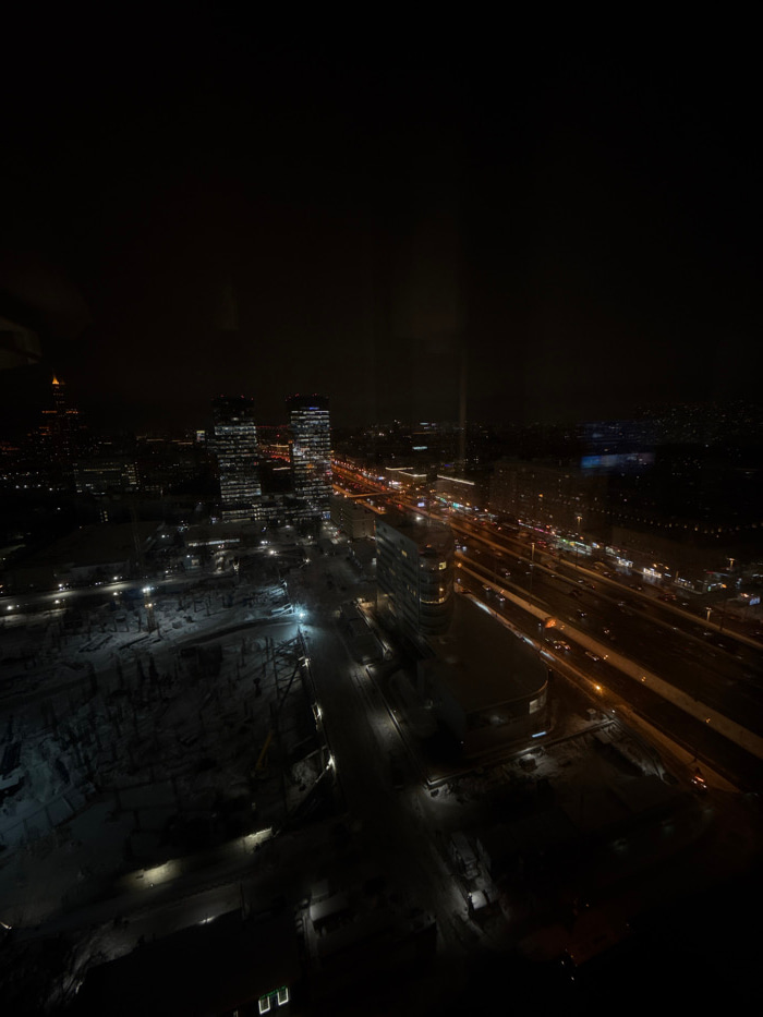 A nighttime aerial view showcases a sprawling city illuminated with artificial lights. Highways intersect, glowing with the blurred streaks of vehicle headlights. Dense clusters of buildings punctuate…read more