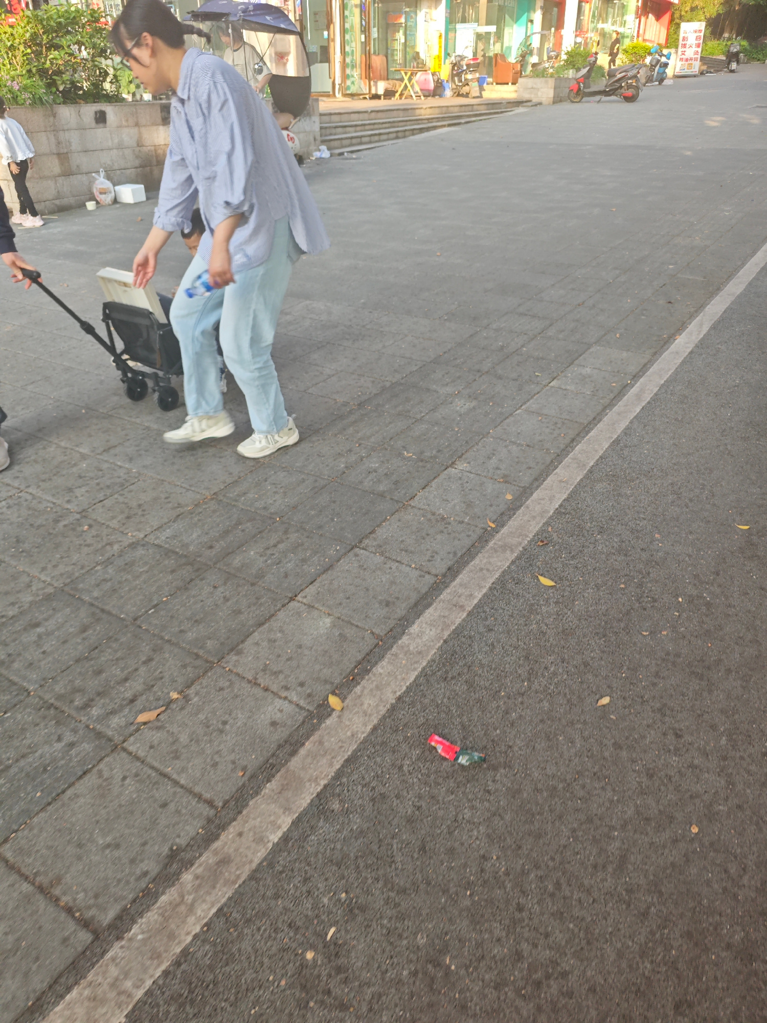 A woman with glasses and a blue striped shirt stands on a paved sidewalk next to a stroller, holding a water bottle. She is accompanied by another individual holding the stroller handle. The location…read more