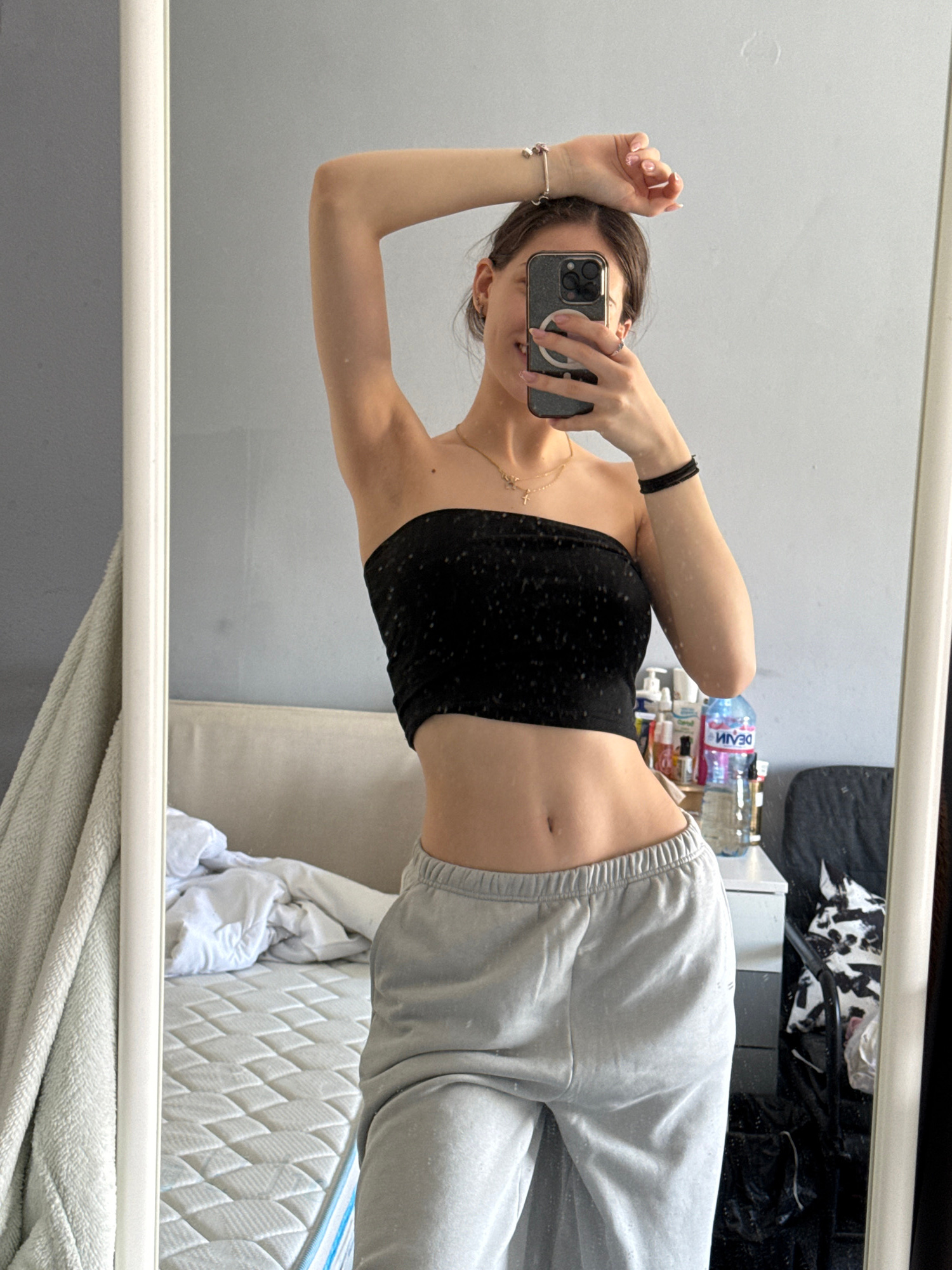 A young woman is taking a selfie in a mirror. She is wearing a black tube top and grey sweatpants. Her left arm is raised above her head. She is holding a smartphone in her right hand, obscuring her f…read more