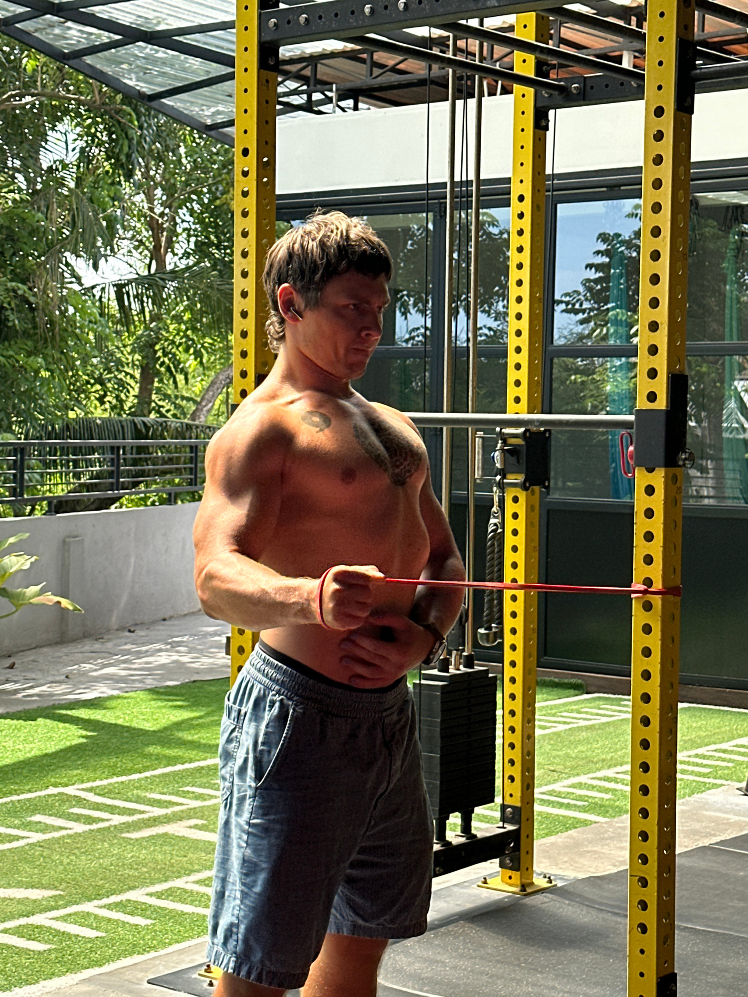 A shirtless man with a tattoo on his chest stands in front of a yellow metal workout rack, pulling on a red resistance band attached to the rack. He is wearing shorts and a watch. The workout rack is…read more