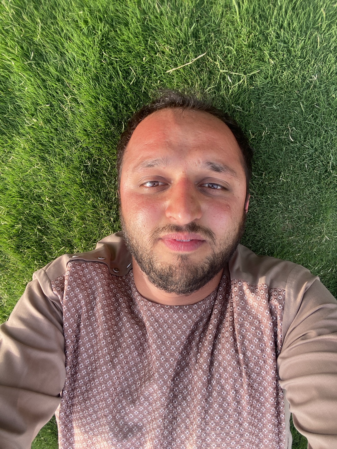 An overhead portrait captures a man lying on his back on vibrant green grass, looking directly up at the camera with a neutral and calm expression. The man's head is positioned towards the upper cente…read more
