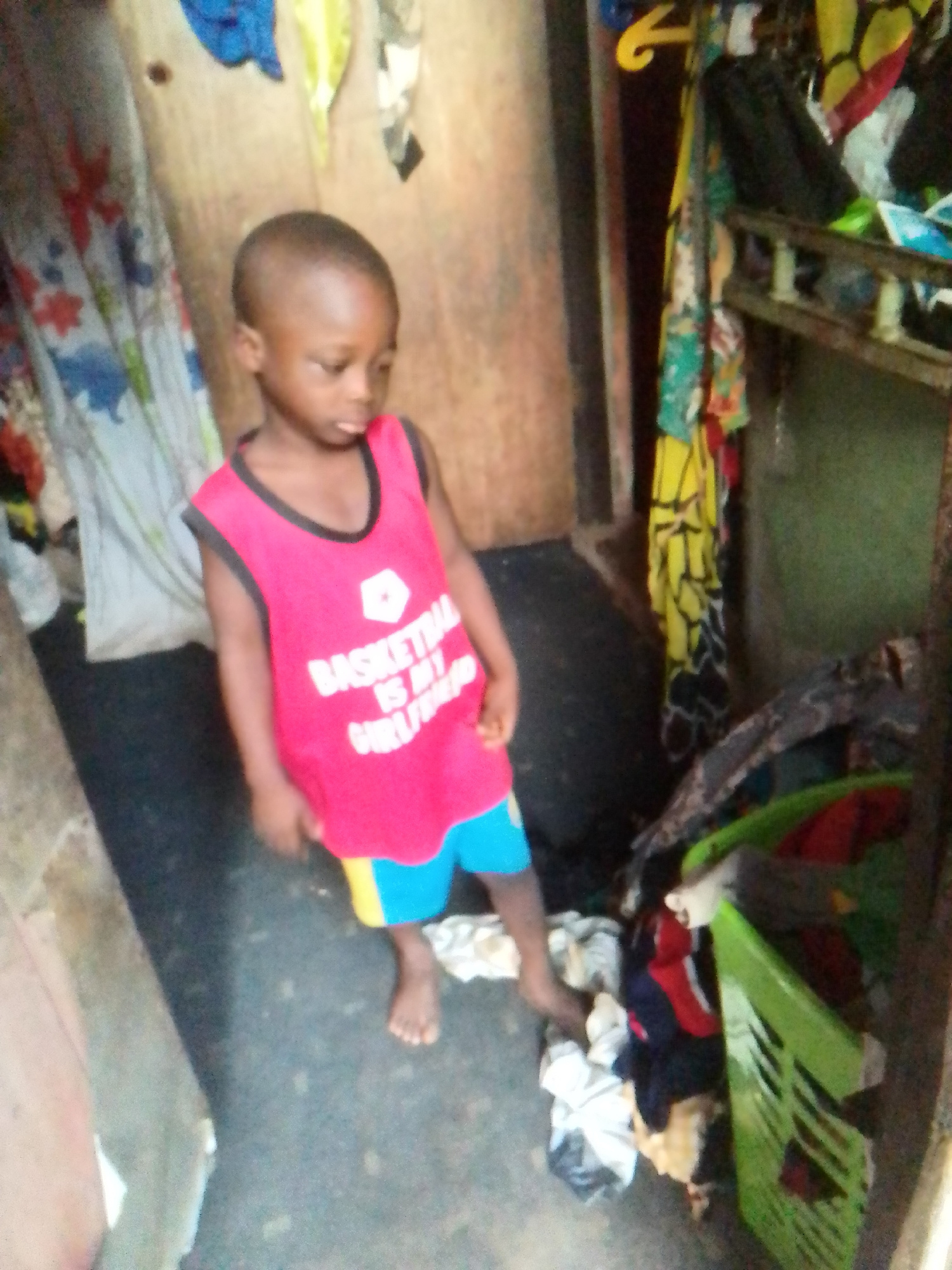 A young boy stands barefoot in a room. He wears a red tank top with the words "Basketball is my girlfriend" and blue and yellow shorts. The room appears cluttered, with clothes draped over furniture a…read more