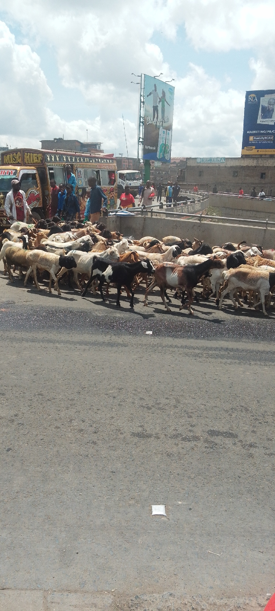 The image depicts a large herd of goats crossing a road in Nairobi, Kenya. The goats vary in color and size. People are standing on the roadside, some near a yellow and red minibus with the word "MISC…read more