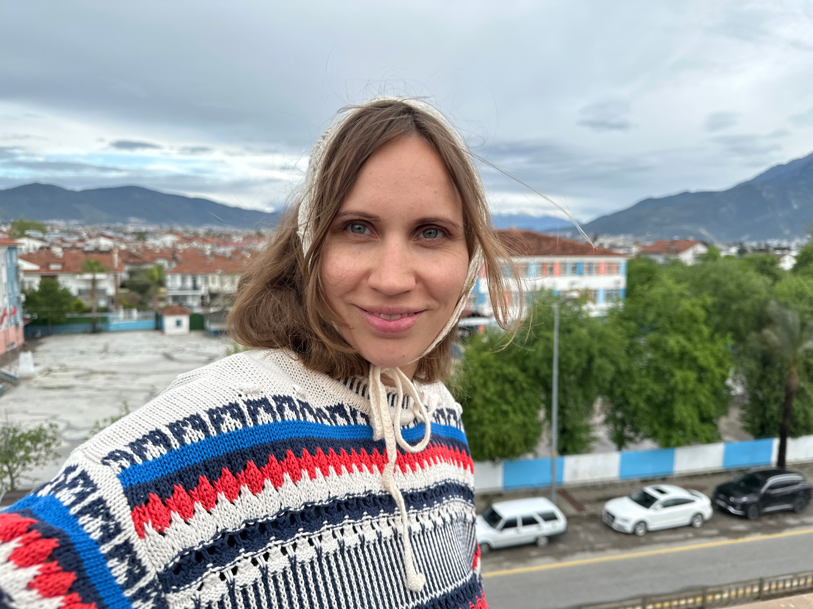 A woman is photographed outdoors, seemingly in Fethiye, Turkey, judging by the mountainous backdrop and the presence of buildings typical of the region. The image appears rotated, with the sky dominating the lower portion and the foreground displaying a view of the city. The woman is wearing a white, blue, and red patterned sweater. In the upper portion of the image, reversed due to rotation, there are parked cars. Trees are visible between the street and buildings. | Open Wire