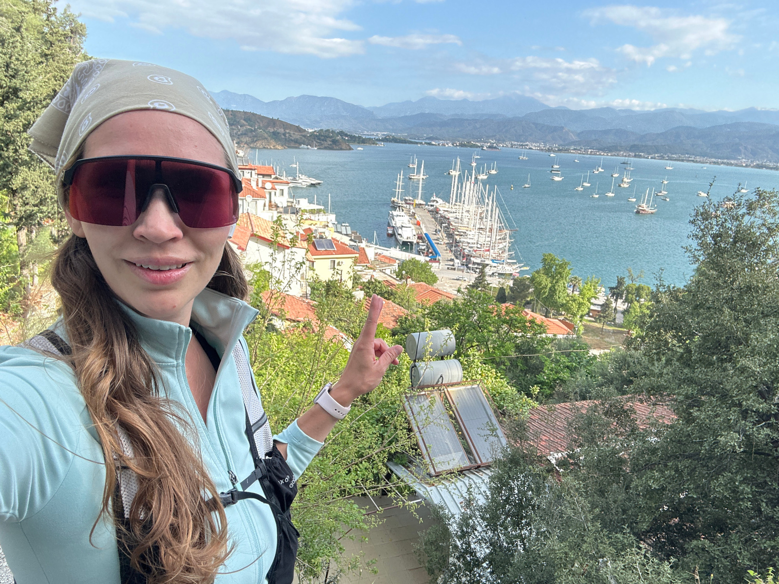 A selfie-style, landscape-oriented photograph shows a woman in athletic gear standing on a hill overlooking Fethiye, Turkey. The camera faces directly at the woman, capturing her from the shoulders up…read more