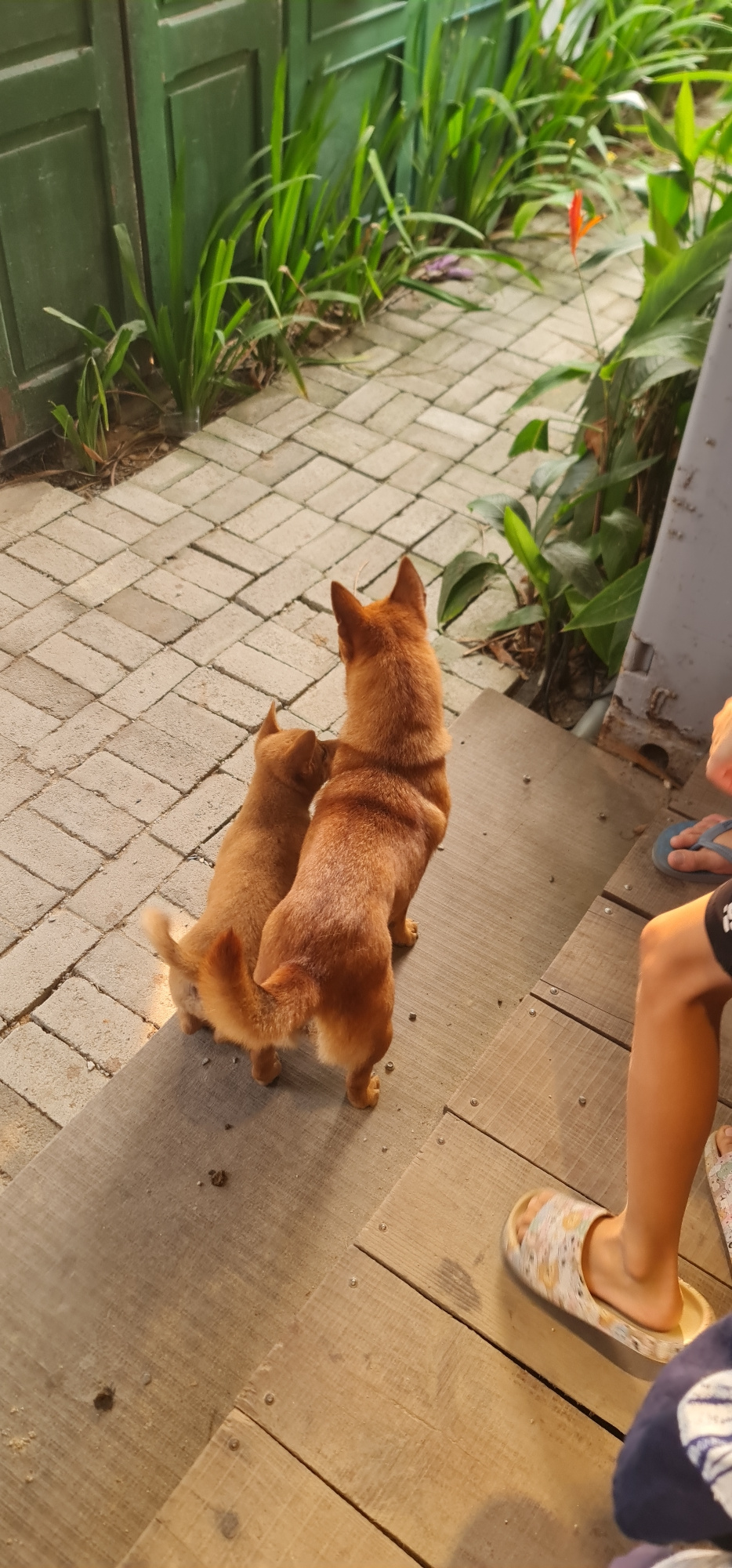 This image captures a warm outdoor scene featuring two light brown dogs, part of a person, and surrounding garden elements. Two short-haired, ginger-colored dogs are resting on a light-colored paved s…read more
