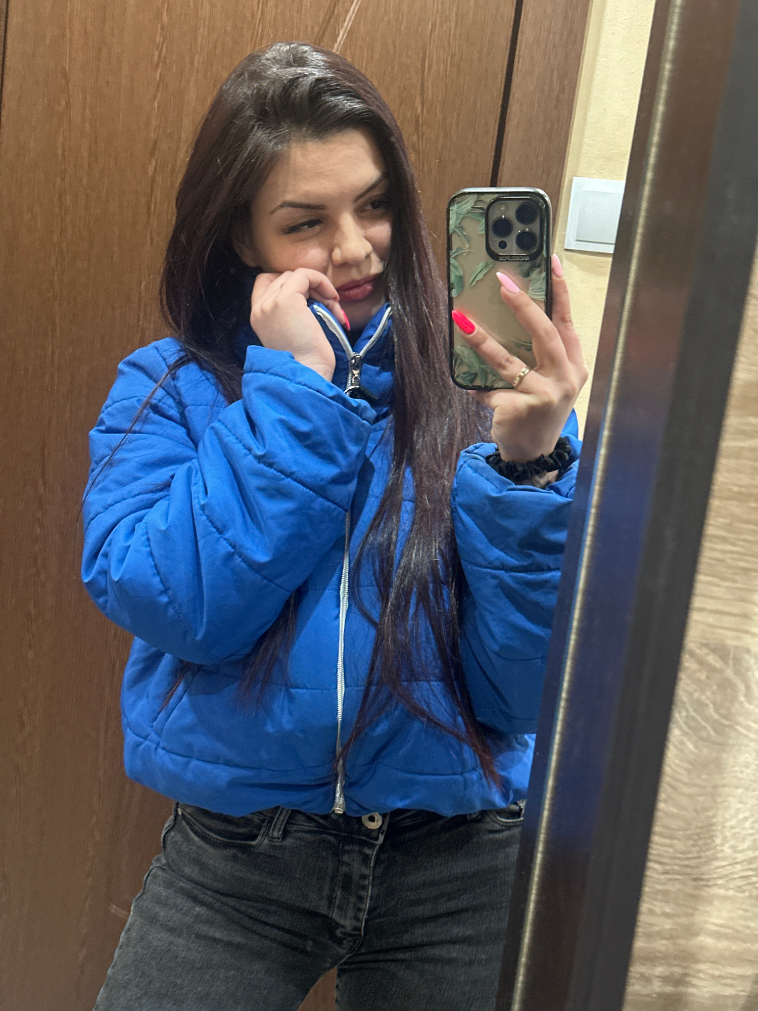 A young woman with long brown hair is taking a selfie in a mirror. She is wearing a bright blue puffer jacket and dark jeans. The mirror is reflecting a portion of a room, including a wooden door and…read more