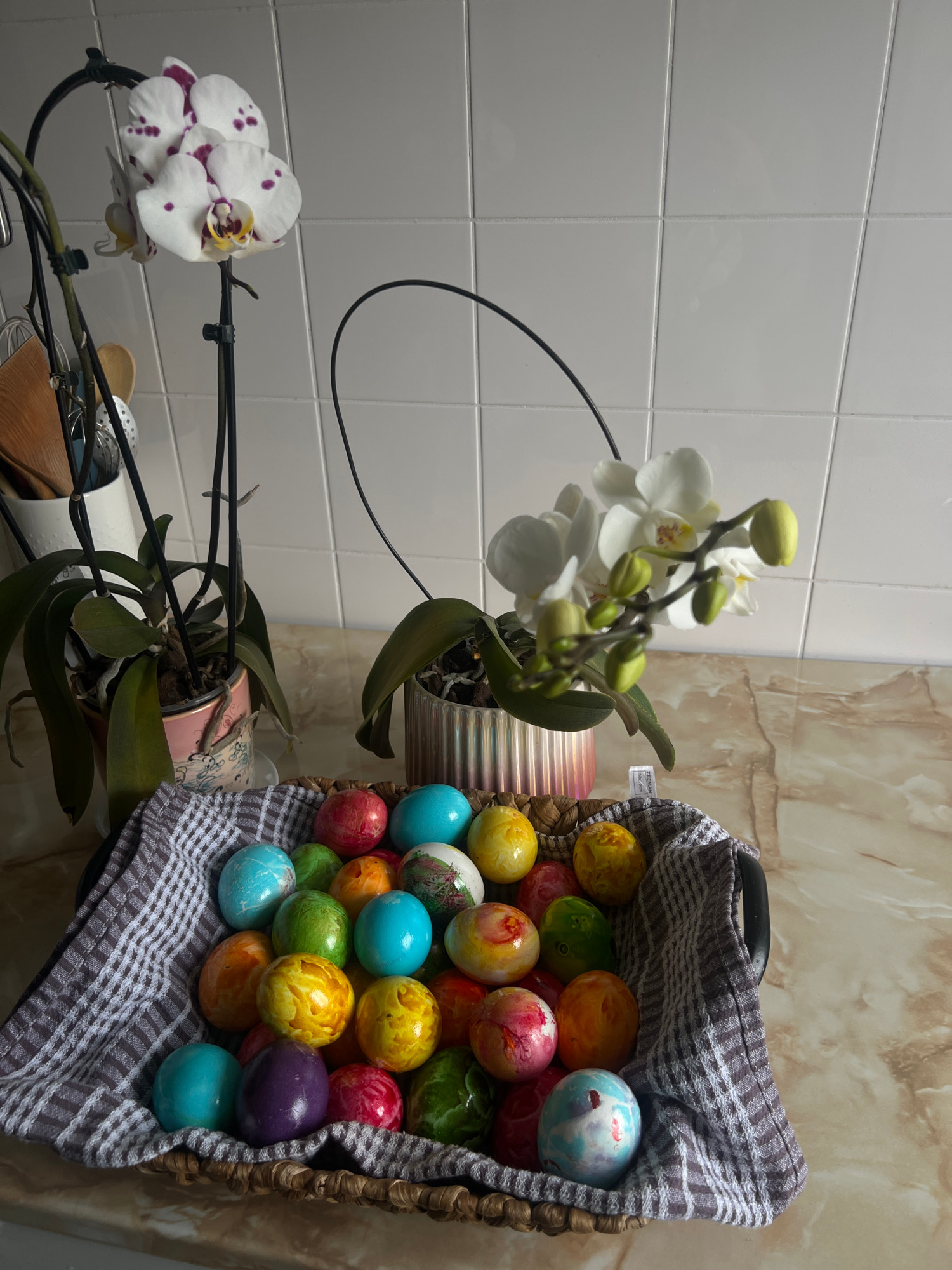 A still life photograph shows two potted orchids, one in bloom with white and purple-spotted flowers, the other with white flowers and buds, positioned to the left of a wicker basket filled with paintβ¦read more