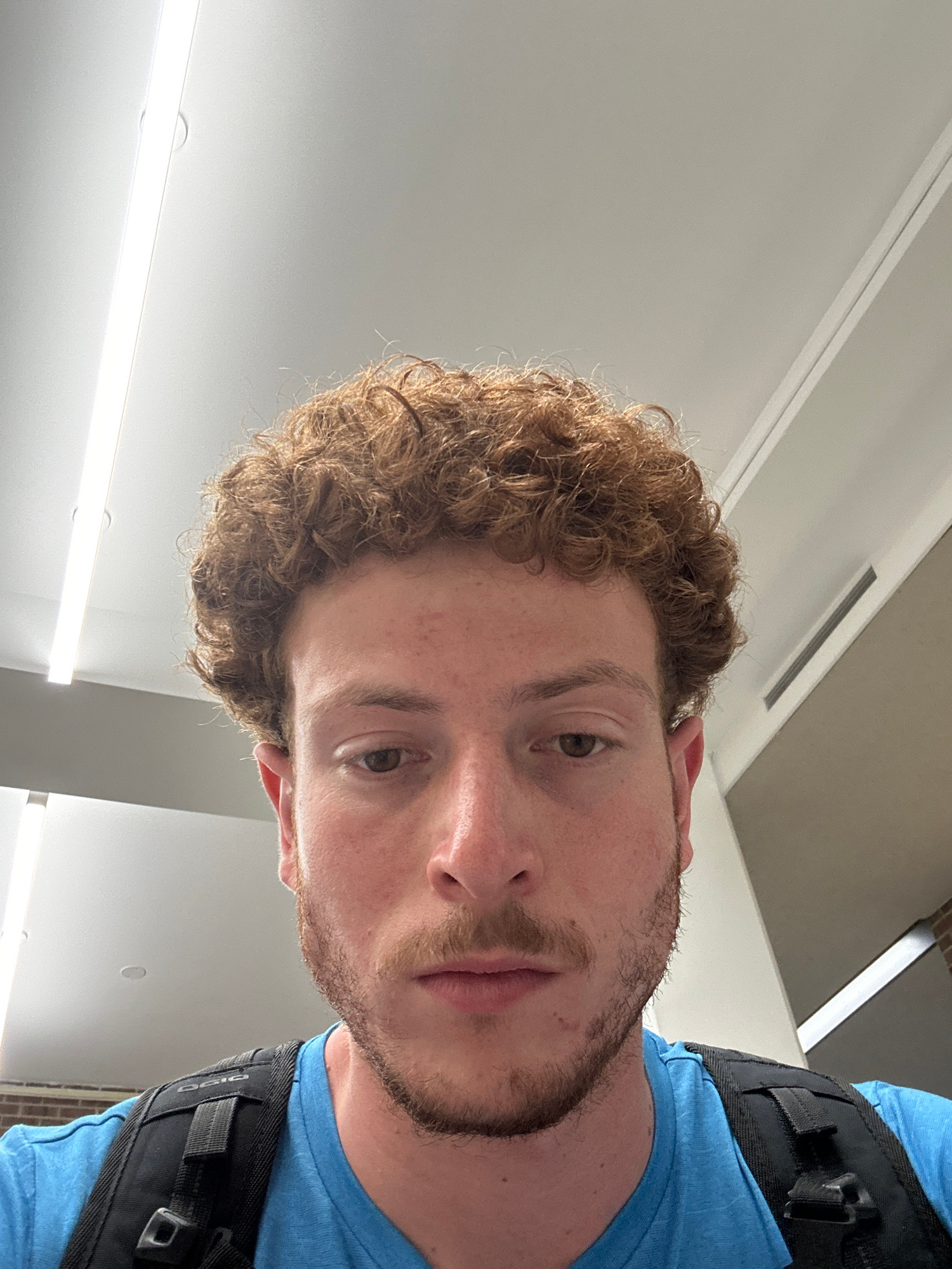 A close-up, selfie-style photo features a light-skinned individual with curly brown hair and a beard. The person is wearing a blue shirt and a black harness-like strap is visible over their shoulder.…read more