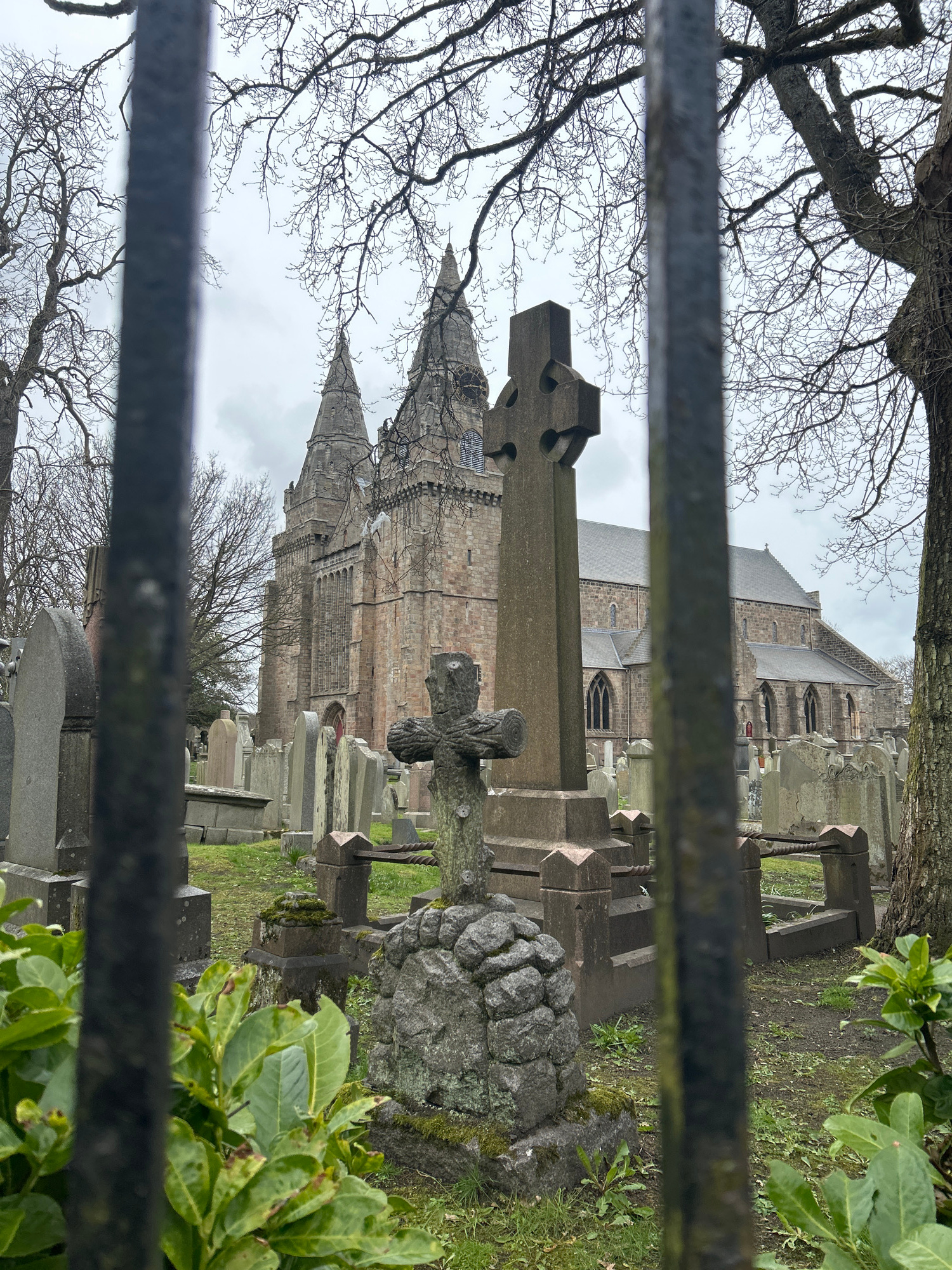The image shows a view through a wrought-iron fence into a graveyard with St Machar's Cathedral visible in the background. The graveyard contains numerous headstones of varying shapes and sizes, inclu…read more
