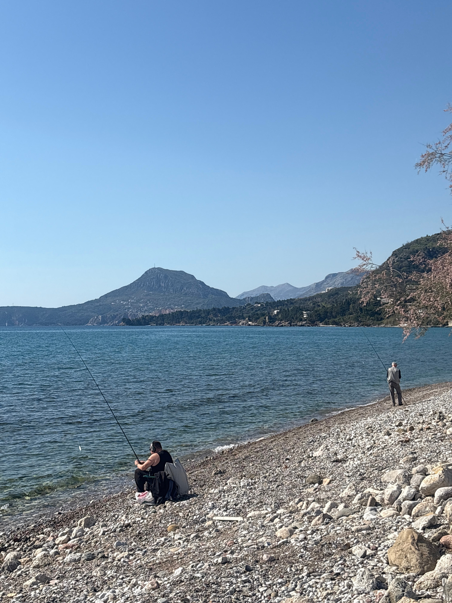 The image depicts a rocky beach scene at an unidentified location near Bar, Montenegro, showing two individuals fishing. The body of water appears to be a lake, bordered by mountains. One person is st…read more