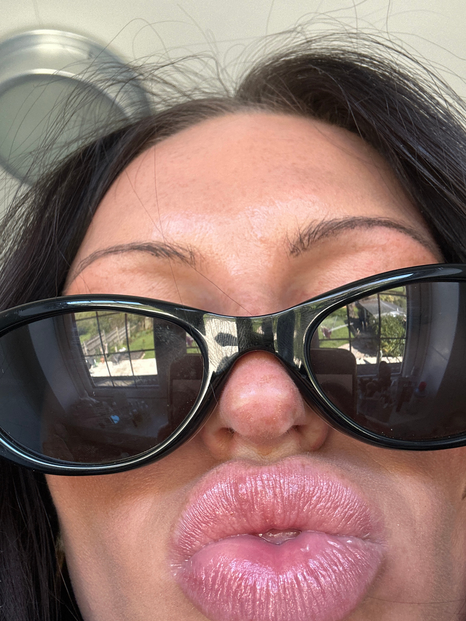 The image depicts a person's face wearing black sunglasses. The reflection in the lenses indicates an outdoor setting, possibly a garden or backyard. The person has dark hair and is wearing a glossy l…read more