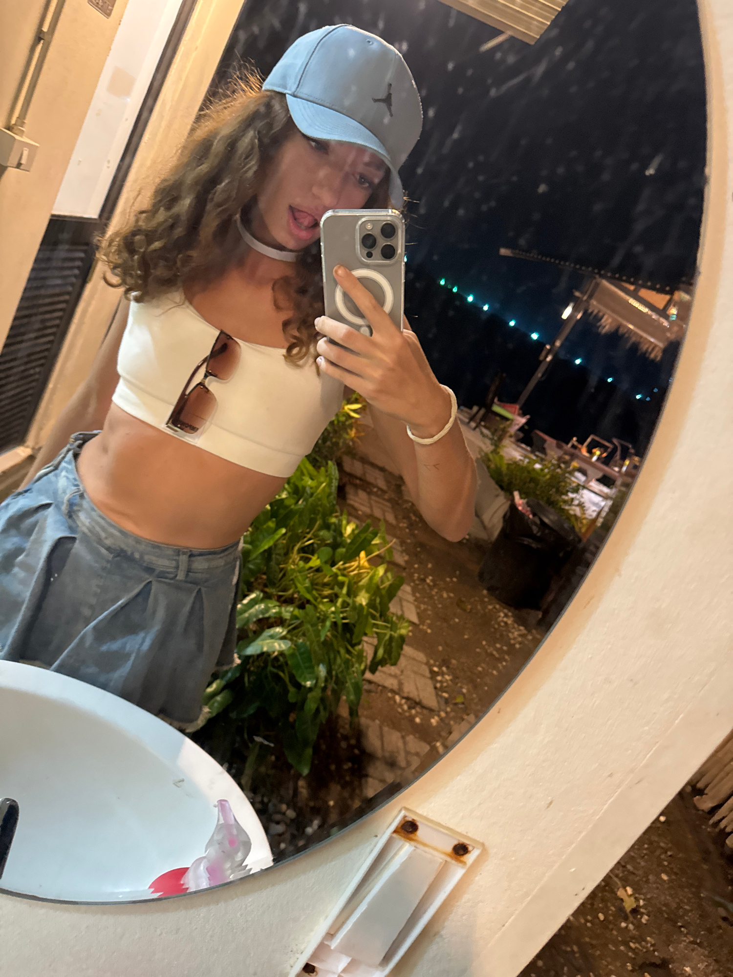 A woman stands in front of a mirror, taking a selfie with her smartphone. She is wearing a light-colored baseball cap, a white crop top, and blue jeans. Sunglasses are clipped to her top. The mirror r…read more