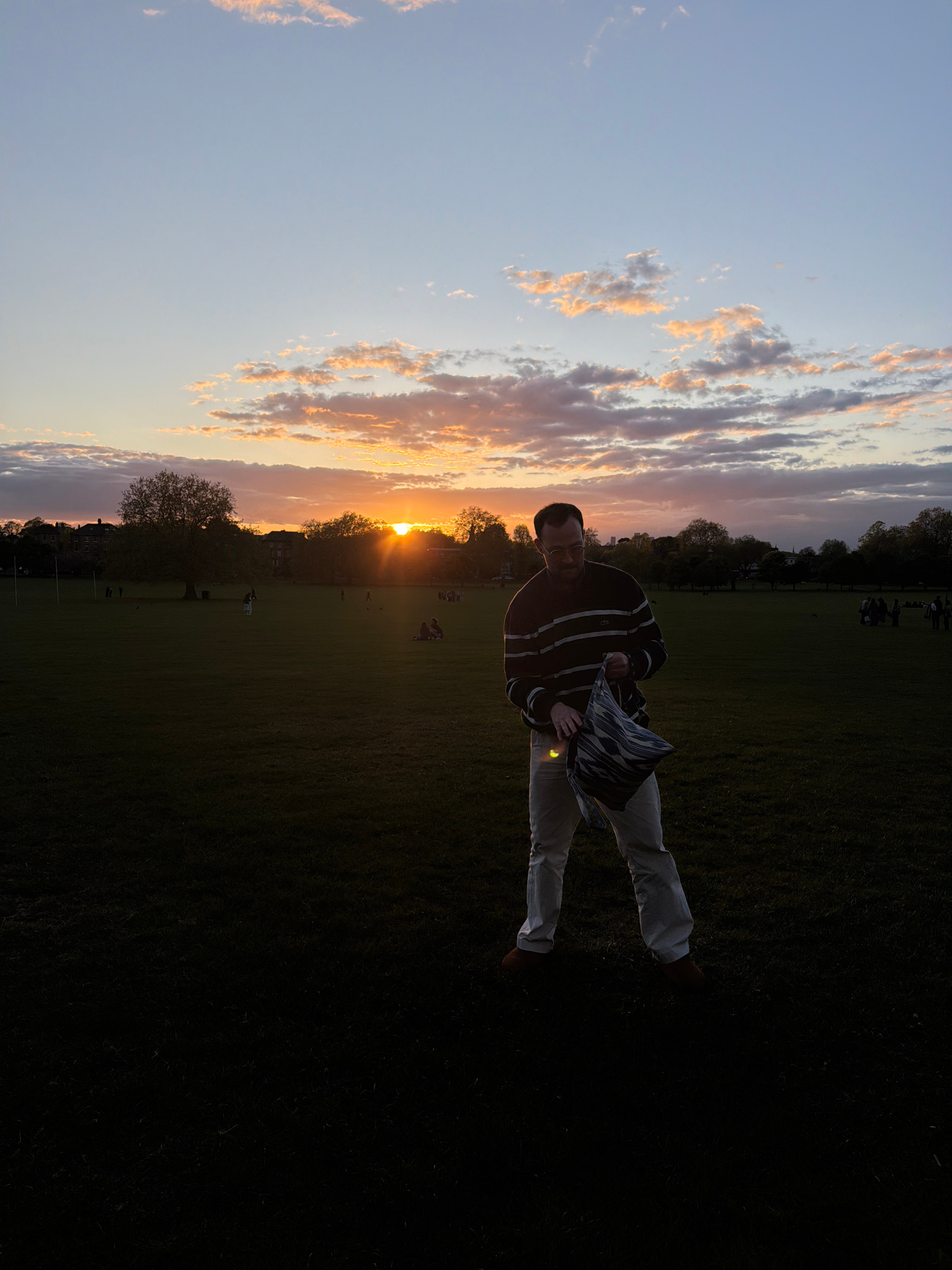 A man stands on a grassy field in London, United Kingdom, silhouetted against a sunset. He wears a striped sweater and light-colored pants, holding a patterned bag. The sky is a mix of blue and orange…read more